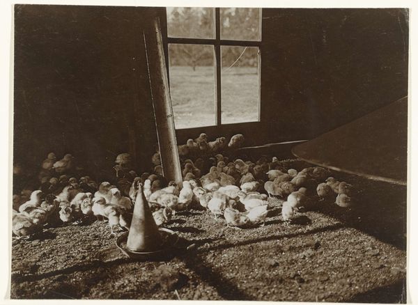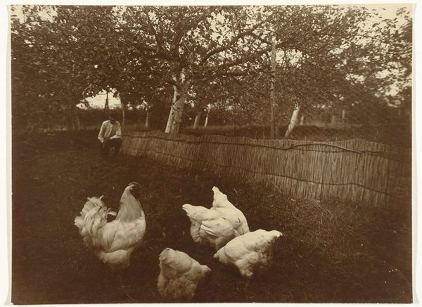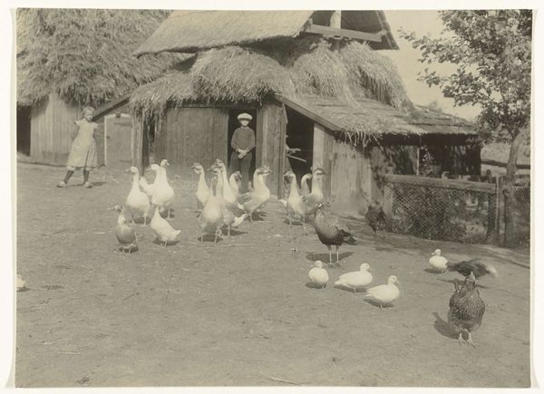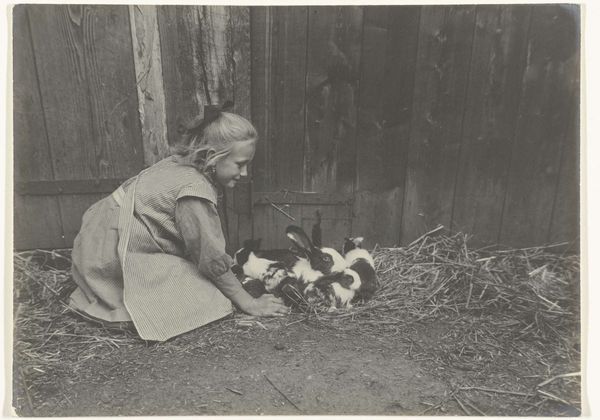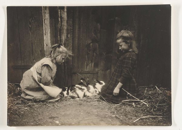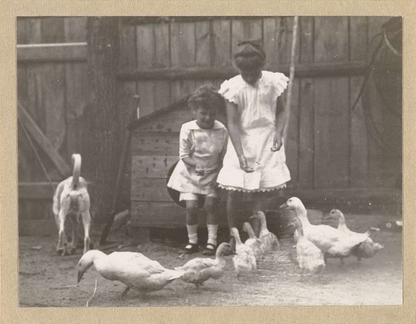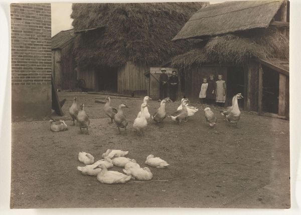 Richard Tepe made this photograph, "Vrouw knielt bij drie ganzen op een boerderij" - Woman kneeling by three geese on a farm - at an unknown date. It's a photograph, but it almost feels like a drawing, right? The way the light and shadow create these soft, tonal gradations, especially on the geese, it feels incredibly intimate, like the artist was right there, sketching. Look at the way the texture of the brick wall contrasts with the smooth, almost porcelain-like quality of the geese's feathers. The woman kneeling, holding a goose, she's like a dark mass in the photo. Her hands disappear into the goose's body. It's a gesture of care, but also a little mysterious. What's going on here? The way the artist captured this fleeting moment, it reminds me of some of the early 20th century photographers, like Gertrude Käsebier, who were pushing the boundaries of photography as art. It's not just a snapshot, it's a carefully composed, emotionally resonant image.