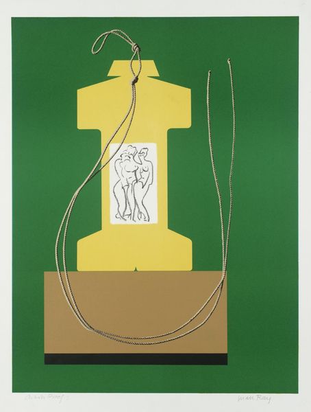 Editor: So, this is Man Ray's "Untitled III." I find the contrast of the industrial shapes with the hand-drawn figures intriguing. What do you see in terms of the materials and their interplay here? Curator: I see a deliberate play with industrial versus handmade processes. The printmaking emphasizes mass production, while the drawn figures suggest a more individual, crafted element. How does this contrast challenge traditional hierarchies of art and craft, do you think? Editor: Maybe it questions what we consider "high art" by incorporating elements of both? It definitely blurs the lines. Thanks! Curator: Precisely! Considering the context of Man Ray's career, this piece reflects a shift in artistic production and reception. It’s about labor and consumption, not just aesthetics.