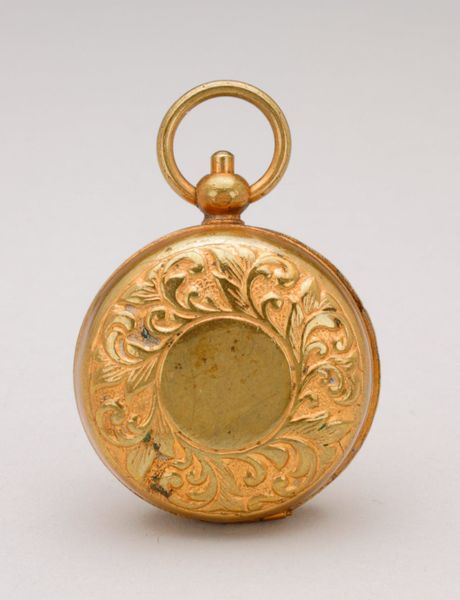 Curator: This striking timepiece is simply titled “Watch,” dating to the years between 1825 and 1835. It was crafted by Jean-Louis Moré and is currently held in the Metropolitan Museum of Art. The piece features intricate metalwork and enamel details. Editor: It's exquisite. The dark background really makes the gold and red floral design pop. It looks so vibrant, yet it also possesses a strange gravity to it. Curator: That striking contrast comes from a meticulous decorative process. The gold detailing wasn’t just applied on the surface; it was likely chased, engraved, and then enameled. Considering the precision involved in creating a miniature piece such as this, imagine the skill of the artisans at the time! The metalwork would reflect not only changing tastes, but the conditions and availability of workshops specialized in such techniques. Editor: The formal structure is so tight. You've got these concentric circles within circles, moving your eye from the centre outward. And that intense contrast of black and red creates almost a vibration. The artist plays beautifully with tension between a perfect geometric shape and the naturalistic asymmetry of flowers. The ring detail up top mirrors and reinforces that geometric tension as well. Curator: Certainly, the formal aspects speak volumes about craftsmanship of the era, but looking deeper at material conditions… Enamel work became popular because it offered relatively durable surface protection for metals susceptible to tarnish. One must remember such an object would likely have been commissioned—a status symbol relying upon specific skilled laborers. It reflects access and privilege as well as artistry. Editor: You're right, these intricate layers can take you to diverse places when you think about it. From production line workers to the rarefied air of patrons! The tension here seems bottomless... Curator: Indeed. It provides much to contemplate, from its physical creation to the implications it held for those who first possessed it. Editor: It's not just a time-telling object; it captures and freezes so many other flows. I'm glad we took time to unpack that.