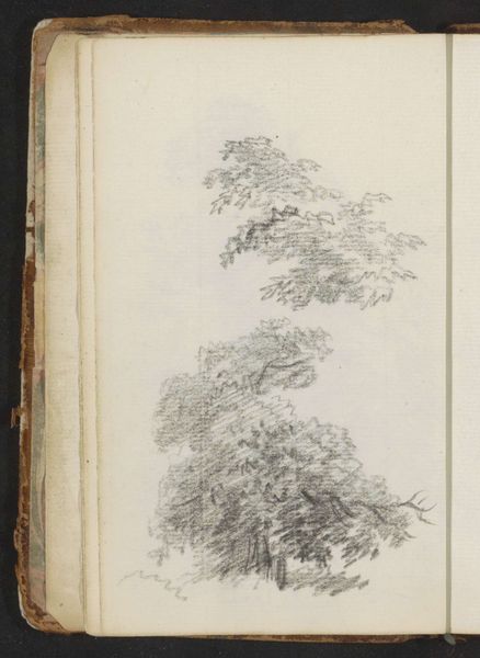 Editor: Here we have Fragonard's "Boom," a drawing from around 1765 to 1775, found in the Rijksmuseum. It's just a simple sketch of a tree, right there in a sketchbook. The texture of the aged paper really strikes me. What captures your attention when you look at this? Curator: Oh, this humble little tree! For me, it whispers of secret gardens and whispered dreams. Think about Fragonard—a master of the Rococo, known for lighthearted, often flirtatious scenes. But here? Just a tree, sketched with such sensitivity. The very lines seem to breathe. It is as if Fragonard, momentarily weary of powdered wigs and amorous encounters, sought refuge in the quiet company of nature. I wonder, what kind of stories could this tree tell? Editor: That’s lovely. I hadn't thought of it as a contrast to his other work, more like a quiet moment. It makes you wonder what he was thinking about, doesn't it? Curator: Absolutely! And isn't it funny? The Rococo period was all about elaborate artifice, but this little drawing…it feels so real. The tree isn’t perfect; the lines are sketchy and immediate. Maybe that’s the beauty of it. What do you take away from seeing the aged paper? Editor: I guess it makes me feel like I am right there, looking over Fragonard's shoulder, seeing something fleeting and personal. Curator: Yes! A privileged peek into the artist's soul. Editor: Exactly. It gives me a new appreciation for Fragonard, seeing this more intimate side. Curator: And perhaps for the hidden stories that even the simplest of subjects can hold!