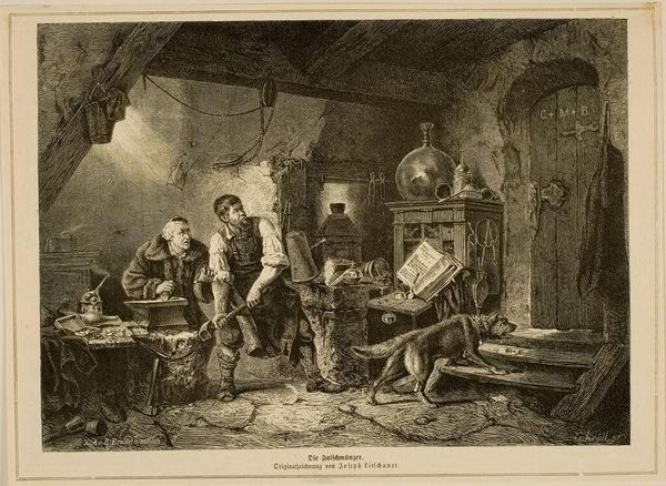 Editor: So, this is Adriaen van Ostade's "Interior of an Inn" from 1653, done with pen, ink and charcoal. It's incredibly detailed, almost like a snapshot of daily life. I’m immediately drawn to the sense of warmth and slight chaos within the scene. What captures your attention when you look at this piece? Curator: Oh, it's like stepping into a dimly lit, smoky tavern, isn’t it? Van Ostade had such a knack for capturing the boisterous energy of these everyday settings. It makes me wonder what stories are unfolding in the space. Do you notice how the light seems to pool around the central figures, almost spotlighting them in their activities? It's as though they are actors in their own play. Editor: Definitely! I see that now. The focus is so much on the interaction between the figures in the center foreground. But beyond just capturing the scene, what was Ostade trying to *say*? Curator: Ah, that’s the beauty of it – the ambiguity. Was he glorifying this simple life, or subtly critiquing it? Perhaps a little of both. There is, without a doubt, keen observation here. The way the bodies are slumped, and positioned so informally in relation to one another...almost a fly-on-the-wall feeling! Van Ostade really lets us observe life's delightful absurdities. And perhaps reflect on our own, eh? Editor: That’s fascinating. It's less a posed portrait and more of an immersive environment that has you in it. I came in seeing just an illustration of a crowded place and now I feel part of that narrative and the lives being portrayed. Curator: Precisely! It speaks to his genius, don’t you think?