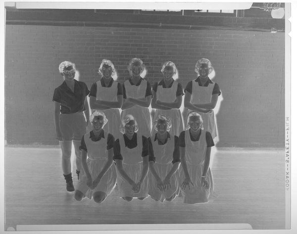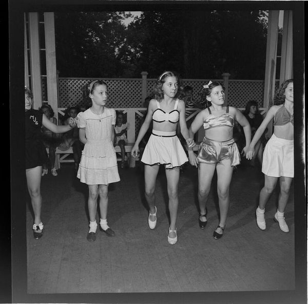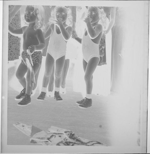 Curator: There's a ghostly charm to this untitled photograph by Jack Gould, part of the Harvard Art Museums collection. It captures children in costumes, seemingly auditioning for a play. The silver gelatin print is quite small, only about 6x6 cm. Editor: My first thought? A poignant memory struggling to surface. The stark contrast, the almost ethereal glow of the figures—it evokes a sense of fleeting childhood. Curator: The inverted tones do give it a dreamlike quality. What strikes me is the vulnerability of these young performers, poised between innocence and the demanding gaze of the audience. Editor: Exactly. Are they thrilled? Terrified? Probably both. You can almost feel the sticky stage lights and hear the murmur of the crowd. What do you think the theatre meant for these girls? Curator: The theater was a community hub, a place where social norms were reinforced and sometimes challenged. These performances offered a space for self-expression and cultural participation, albeit within certain limitations. Editor: It also offered an early stage for navigating the world of performance and spectacle, which feels both empowering and a bit unsettling. Thanks for sharing your insight. Curator: Indeed. It's a reminder of how public life, even in childhood, is often a carefully constructed performance.