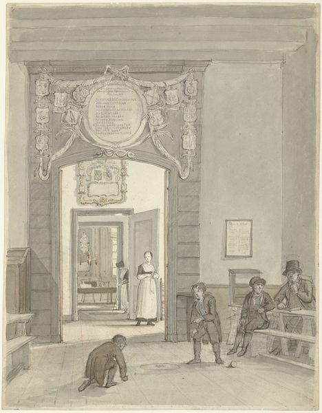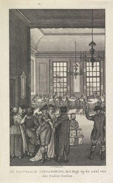 Editor: This is "Catechisatie," an 1863 etching by Eberhard Cornelis Rahms. It has such a hushed, serious tone; the interior feels almost theatrical with its sharp angles and focused light. What do you make of this depiction of religious instruction? Curator: It's interesting you say "theatrical." Look how Rahms positions the scene within the visual language of Realism. This print becomes not just a representation of catechism, but a statement about the role of religion in shaping societal norms. Where would this scene take place and what could this mean? Editor: Perhaps a small parish, judging by the simple architecture? It could represent how religious instruction served as a cornerstone for community cohesion and moral guidance within these societies? Curator: Precisely. And notice how the artist uses light and shadow, coupled with the gaze of those on the podium, creating a visual hierarchy. Who is given a voice here? What are the institutional forces on display? Editor: It's clear there is emphasis on those in positions of authority - it seems very pointed to show their point of view in a literal higher perspective. What would this entail, if you have any idea? Curator: Likely this involves specific doctrines being propagated. This imagery plays into power structures, showing the Church's influence through a controlled setting like religious classes, while suggesting broader social obedience through religious learning, which extends to other spheres in life. Editor: It feels much less like a simple snapshot of the past now, and more like commentary on faith and governance within a very specific time! Curator: Exactly. By examining the historical context, we unlock how visual language upholds the structures within these communities, past and present.