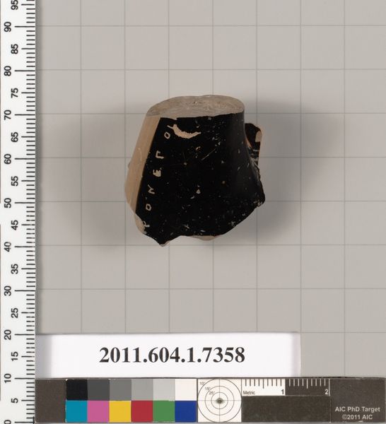 Editor: This is a terracotta fragment of a kylix, a drinking cup, dating back to 500 BC. It’s currently housed at the Metropolitan Museum of Art. It's just a piece, really, mostly black with some banding. How do you interpret this work? Curator: Well, immediately, I see a powerful symbol of cultural endurance and loss. It's a fragment, yes, but it speaks volumes about the rituals, social structures, and gender dynamics of ancient Greek society. Kylixes like this weren't just functional objects. They were central to symposia – gatherings of men, where they drank, debated, and forged political alliances. Think about who was excluded from that space and the stories that were never recorded on these vessels. Does that give you pause about celebrating this craft as a simple artifact? Editor: I hadn’t considered the limitations of whose voices were represented. Curator: Exactly. So, while the craftsmanship is remarkable, consider how the scenes depicted—likely mythical or heroic narratives—reinforced existing power structures. Were women, enslaved people, or foreigners typically centered in the stories decorating these cups? Unlikely. So, what does it mean to hold and admire a piece like this today, knowing its historical context? Editor: It challenges us to be critical about what we celebrate from the past. Even something as seemingly simple as a drinking cup becomes a site of complex social and political narratives. Curator: Precisely. It’s a conversation starter, not just a relic. Seeing this fragment not only connects us to the past but compels us to reflect on the silences and exclusions inherent in that past, and how they resonate today.