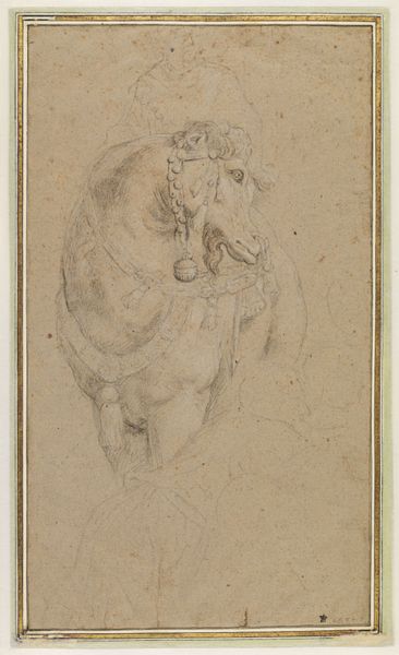 Carlo Saraceni created this captivating study of a centaur sometime between 1579 and 1620, using brown wash and pen on paper. The oval composition immediately draws the eye to the mythical creature, its form emerging from a cloud-like background. The artist masterfully employs line and shade to give shape to the centaur. Note the careful use of hatching to model the musculature of the human torso and the equine body, creating a sense of volume and depth. This technique also serves to integrate the figure with its setting, blurring the boundaries between the tangible and the ethereal. The centaur itself embodies a destabilization of established categories, merging human intellect with animal instinct. Consider how Saraceni’s formal decisions contribute to the overall impact of the work. The use of a warm brown wash creates a sense of unity and harmony, enhancing the dreamlike quality of the scene. This careful manipulation of form and medium not only demonstrates Saraceni’s technical skill, but also invites us to contemplate the complex interplay between nature and culture.