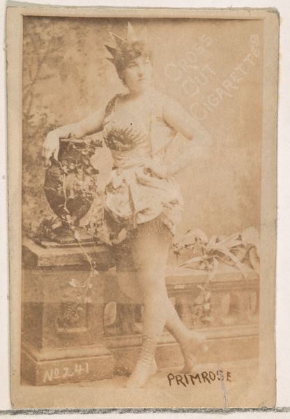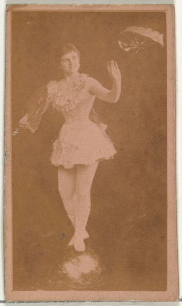 Editor: Here we have a print from Goodwin & Company, dating between 1886 and 1890. It's called "Mlle. Legrande, Paris, from the Actors and Actresses series (N171) for Old Judge Cigarettes." It feels quite delicate, almost like a faded memory. What strikes you about this piece? Curator: What I see is a fascinating intersection of commerce and art. We need to look at the materiality of this object - a card produced to sell cigarettes. Consider the labor involved, from the photographers to the printing process, and the tobacco farmers themselves. How does its function as advertisement shape our understanding of this image of Mlle. Legrande? Editor: That’s a good point. So it's not just a portrait, but also part of a bigger industry? Curator: Exactly. The mass production of these cards created a demand, fueled by capitalist motives. Think about the social context of collecting – what did owning this card signify? Who had access to it? Editor: So, it's about access and consumption. How does seeing it that way change how we think about Mlle. Legrande herself? Curator: We must view her not just as an individual, but as a commodity herself. She is participating in a system that profits from her image, promoting an aspirational lifestyle connected to smoking. The blurred aesthetic quality also suggests the fleeting nature of fame and its inherent consumability. Editor: This has completely changed my perspective! I was initially focused on the artistry, but the materialist approach really highlights the power dynamics at play. Curator: Precisely. By examining the material and the process of production, we unlock a far richer understanding of the artwork and its place within a broader economic and social landscape.