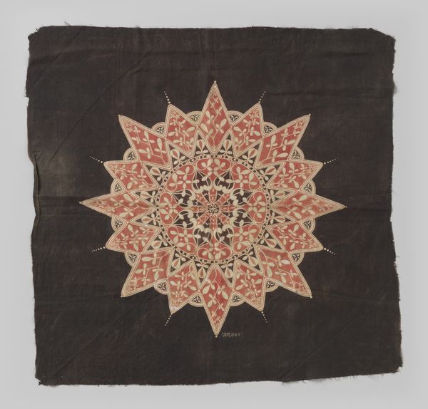 Curator: Let's discuss this striking batik cloth, dating to around 1910 and titled "Gebatikte sierdoek met gestileerd Oosters motief," translating to "batik ornamental cloth with stylized oriental motif". Editor: My immediate impression is one of controlled vibrancy. The colour palette, predominantly burgundy and muted blues, evokes a sense of calm. The repeating radial patterns hint at an interesting process, but tell me more about the intended cultural function, and if this artwork, with its stylized motifs, tells us about the world at the time. Curator: Absolutely, let's place this textile within its historical moment. Created during a time when European engagement with Asian artistic traditions was peaking, we see an orientalism filtered through the lens of decorative arts, it likely speaks to Dutch colonialism. Such objects were circulated amongst those connected with Colonial administrators. The "exotic" motif made accessible to European audiences reflects a power dynamic inherent in these cross-cultural exchanges. Editor: It certainly embodies the romanticized vision that came to characterize much decorative art of the period. But, what can we gather about its creation? Looking at the execution, the repeated elements suggest the use of some kind of resist dyeing, the build up of dye onto textile in patterned sections suggests intense labor, the type that we often ignore with a quick appreciation for aesthetics. What exactly is "batik?" Curator: A very good question. Batik involves using wax to resist dye on cloth, building up patterns through layers. The material, probably cotton, would have been stretched and prepared, a team involved in waxing and dyeing multiple times. The skill inherent to its manufacturing would have held value. Understanding those labor dynamics is just as essential to understanding cultural nuances. Editor: It really pushes against the Westernized division of art and craft, doesn't it? A labor-intensive craft becomes an art form with social meaning beyond the beautiful design. Curator: Precisely! It challenges the very boundaries and values Western art institutions often impose. Editor: Considering the objectness of it, I start to wonder about its journey—where it was displayed and ultimately how it landed here for display. All aspects, and points of origin, feed into the ongoing global movement of art. Curator: And, perhaps more important than a passive analysis of what something 'is,' thinking about the labor is central to how something "becomes." I’ll consider the piece further from this materialist viewpoint, you've successfully tweaked my interest. Editor: The power of texture, craft and history. I leave thinking about labour, commodification, and the legacies involved in something visually simple, and pleasing.