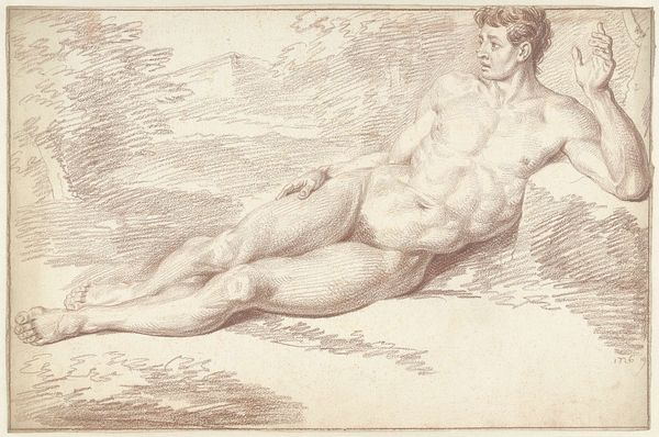 Editor: Here we have "Adam, after Michelangelo," attributed to August Temmel. It's a chalk drawing of the reclining figure of Adam. The pose is so familiar, but here, alone, the figure feels vulnerable. What statements do copies like this make about the original? Curator: This work highlights the role of the academy in disseminating and standardizing artistic ideals. Copies like this were often made for study, perpetuating Michelangelo’s vision as the epitome of human form. How does knowing it's a copy influence your interpretation? Editor: I suppose it makes me think about artistic authority, and who gets to define "great art". It definitely changes how I see it. Thanks! Curator: Precisely. It reveals the politics embedded within art education and the power structures that elevate certain artists and styles above others.