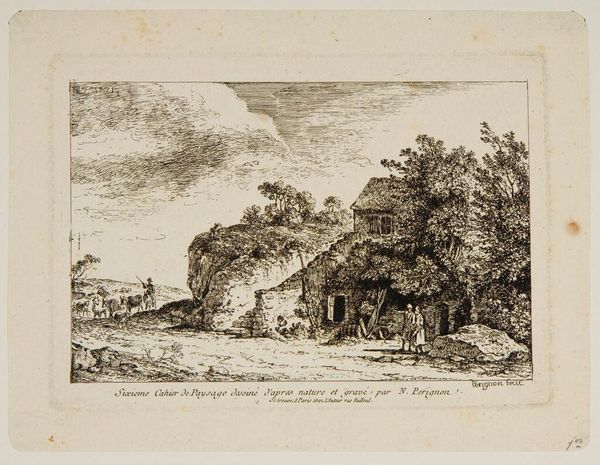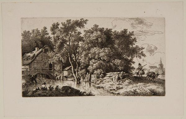 Curator: Standing here, we're looking at Hendrik Schwegman’s “Farm on the Water and Fisherman in Boat,” dating back to 1786. It's an etching, ink on paper, currently held in the Rijksmuseum. Editor: It’s evocative. Bleak, almost, in its stillness. The muted tones really emphasize the solitude of that waterside dwelling. You can almost feel the damp air. Curator: Genre paintings such as these offer us glimpses into the daily life and values of the period. The landscape and the economic conditions, they influence and are influenced by these humble depictions. This one aligns strongly with the conventions of the Dutch Golden Age landscapes. Editor: The focus on ordinary life does democratize art to a degree. But how "ordinary" was this really? Whose perspectives were centered, and whose were deliberately excluded from these depictions of quaint rural life? It's quiet—too quiet, perhaps? Where are the voices of those who truly labored to build this landscape? Curator: The Dutch Golden Age coincided with an era of massive global trade and colonial expansion. Do you think the detailed execution we see in Schwegman's prints, and the market for them, directly relied on those trade routes and the wealth derived from the colonies? Editor: Absolutely. Landscapes weren't just pretty scenes. They also symbolized ownership, national identity, and of course, obscured some harsh colonial realities. This image may seem innocuous, a quaint, tranquil waterside moment but whose tranquility was it really and at whose expense? It certainly seems like it lacks a social conscientiousness to the time and, frankly, lacks depth. Curator: That reading is spot-on. The very act of representing these scenes became intertwined with societal power structures and evolving political narratives. How can museums present the work and give insight to our patrons, acknowledging not just the work but the world around the work? Editor: Exactly! Bringing in contemporary voices—artists, activists, theorists—can really enrich the historical narrative, push beyond the expected, and reveal the complex social fabric that made this image possible. That's the goal to give all who gaze upon this to truly see beyond the beauty. Curator: Absolutely, reframing it is a social responsibility for museums. Editor: Precisely. It allows us to engage honestly with the complexities of history.