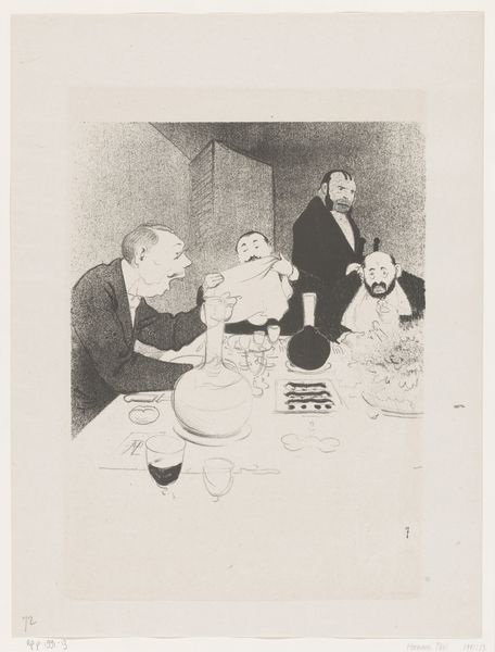Patricq Kroon created this drawing, "Ministers aan het paasmaal," using ink on paper, a common medium for political cartoons. The stark contrast of black ink on white paper lends a directness to the image, highlighting the satirical intent. Kroon has rendered the scene with crisp lines, focusing on the caricature of the three figures and the symbolic weight of the bowl filled with eggs. These eggs, each labeled with political issues, aren't just incidental; they are central to the work’s meaning. The artist's choice to depict these men with such exaggerated features underscores his critique of their policies. The level of detail suggests careful planning, with each egg acting as a visual representation of complex political debates. The work, therefore, isn't just a drawing but a commentary on governance, labor, and the issues facing society at the time. It challenges the viewer to consider the material realities behind political decisions.