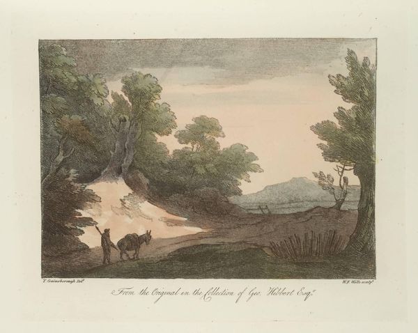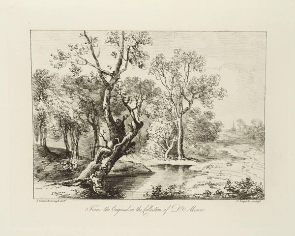 Editor: This is an untitled landscape etching by Thomas Gainsborough. The scene feels so serene, almost like a memory. How do you interpret the symbols embedded in this seemingly simple landscape? Curator: The winding path and the shepherd with his flock carry potent symbolism. Consider the path as the journey of life, each twist representing choices, and the shepherd as a guiding figure, a protector leading his followers. Editor: So, it's not just a pretty picture, but a reflection on life's journey? Curator: Precisely! The trees, gnarled yet standing, could signify resilience, while the distant buildings hint at the aspirations and societal structures that frame our lives. The imagery connects to our shared cultural understanding of nature and human existence. What lasting impression does that leave you with? Editor: I see a deeper meaning in the everyday now. Thanks! Curator: It’s a pleasure to unpack these hidden narratives.