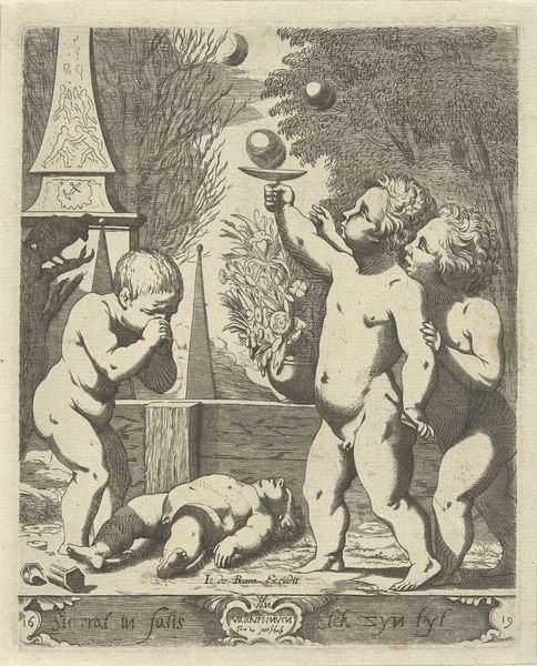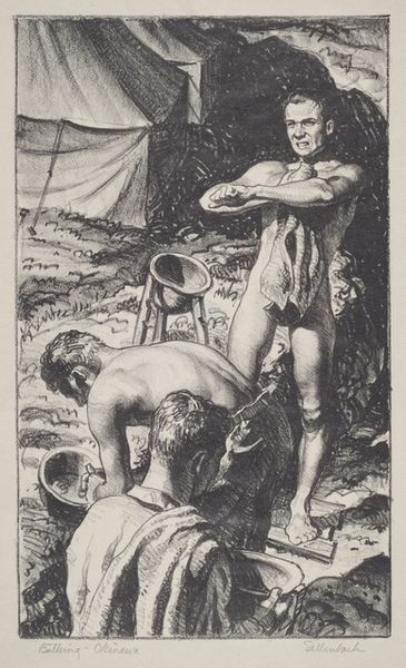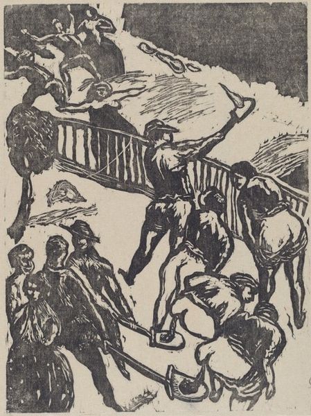 Curator: Looking at this compelling print, “Spirit of New York,” created by Fugi Nakamizo in 1925, I immediately sense a tension, almost an anxiety. It's quite raw, wouldn't you agree? Editor: Raw indeed! And striking, especially given the medium. One immediately focuses on the figures: are they resisting or succumbing? The texture gives the entire image such depth—you can see the physical labor behind its creation, the density of lines Nakamizo used... What inks were accessible at that time? And was the paper itself locally sourced? Curator: It's fascinating how Nakamizo layered diverse symbols here. Notice the commanding, almost grotesque figure looming over the cityscape— a guardian or a demon? And what of the dancers? The one brandishing what appears to be a small axe feels particularly loaded with possible interpretations. It echoes a lot of anxieties that artists shared regarding a changing world. Editor: Yes, these recurring iconographies echo deeper into the symbolism that emerges over and over in narrative art, the idea of transformation, particularly relating to the axis of labor versus capital... The body almost seems a contested site; you've got active figures laboring alongside more passive figures holding what I think is debris from buildings. It could serve as a powerful allegory about social classes and structures during New York's growth, post WWI. It really makes you question: Who built this city? At what cost? And at who's expense? Curator: Absolutely. And speaking of cost, that brings us back to the materiality of it. I wonder what prompted Nakamizo's specific choice to work with drawing and printmaking during that era of rapid industrial expansion and how print might serve the eroticism apparent in his other works? Was it simply more accessible, or did the medium itself carry a particular symbolic weight? Was it disseminated widely or a rarity from its beginnings? It leaves me wondering how those figures' gestures played to their intended audience back then... What did viewers make of all these active symbolisms in 1925? Editor: It’s a powerful statement either way; knowing its context gives a new appreciation for not just Nakamizo's choices as a maker but the symbolic struggles so central to urban life back then— and now. It almost challenges us to reflect: which figures do we emulate today? Which figures get trampled under our feet? Curator: It seems with all of Nakamizo's layered symbolism he offers not answers but difficult questions to anyone looking back at "The Spirit of New York." Editor: Indeed, quite the evocative use of layered techniques with profound meaning. It’s truly hard to shake off the mood that emerges from such deft deployment of symbol-laden choices in this image!