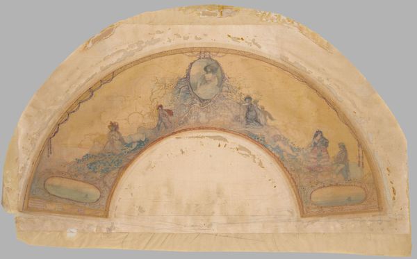 Editor: Here we have Joseph Smith's "Madonna and Child with Angels." It’s a small work, roughly 24 x 32 cm, held at the Harvard Art Museums. I'm struck by its unfinished quality and the muted palette. What do you see in this piece? Curator: The fresco fragment's composition employs a traditional lunette format. Note the circular arrangement emphasizing the Madonna's centrality. How do the partial renderings and the visible underdrawing affect your perception of the work? Editor: It feels like a glimpse into the artist's process, a study rather than a finished statement. Curator: Precisely. The visible brushstrokes and color choices create a dialogue between representation and abstraction. The incomplete form invites a deeper engagement with the artwork's materiality. Editor: I see what you mean, it’s as if the form itself becomes a subject. Curator: Indeed. Thank you, I will consider that.