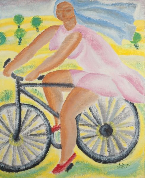 Curator: Right, let’s take a closer look at "Pedal Pushers," a drawing by Greg Hildebrandt. At first blush, what leaps out at you? Editor: That's pure, unadulterated sass! It's like a pin-up poster come to life in pencil and vivid color. The high contrast, the cheeky pose...it's got a playful, rebellious energy, but it also kind of reeks of idealised female beauty from mid century, and all the problems and possibilities associated with that image-making tradition. Curator: Absolutely. And note the medium: pencil on, what looks like, black paper. Hildebrandt’s play with light and shadow is masterful. The stark contrast between the monochrome figure and the bold pops of the red top and, especially, that bright blue bicycle… it’s captivating, like a dream caught in graphite. Editor: The contrast is deliberate, for sure. The choice of only using full color to draw the viewer’s eye toward a fetishised object/idealised freedom. Like it’s drawing a dividing line. This tension of accessibility/freedom and exclusion. But it’s so stylized; it begs the question, is this artful critique, or artful promotion? Curator: Now there’s a delightful can of worms. It's not clear whether he critiques it, as he gives in to a certain gaze that permeates, even celebrates it. The woman on the bike exudes an attitude. It’s confident, bordering on arrogant. The barefoot adds to that. You almost feel complicit in admiring a projection… the ideal “biker babe”. The whole composition feels calculated, you know? Every line, every shadow. Editor: Indeed. The pose, the gaze, it's all meticulously crafted. Think about who's riding on whose 'freedom', the idea of liberation isn't without caveats in the patriarchy, especially as related to that vintage glamour. There is a performativity to this work which is a reflection of what some call second wave feminism, or popular media surrounding those notions. This is an icon alright! I am curious how a contemporary eye will gaze upon this depiction. Curator: I agree entirely! This image is provocative and powerful in its use of the figure to examine some fundamental cultural ideals. I feel a little uncomfortable but mostly enlivened. And Hildebrandt made this artful, pointed claim sing—I see a little wry smile lurking in the shadow of this drawing, you know? It doesn't get boring easily, which is maybe all one can ask for! Editor: Exactly! Like cycling through the historical, seeing where we've been, where we are now... "Pedal Pushers," indeed. We might all be pedaling somewhere in life; some further, or more confidently, than others, and it pays to be reminded to examine what is propelling us onwards.
