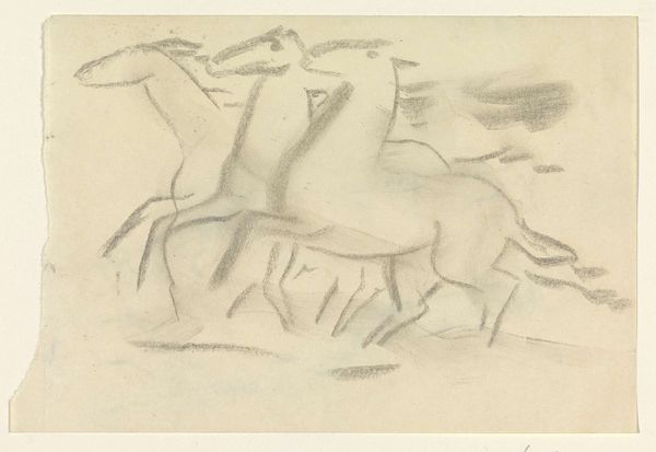 Curator: Leo Gestel created this work, "Galopperende Paarden," sometime between 1891 and 1941. It's currently held here at the Rijksmuseum. You're looking at a drawing executed in pencil. What springs to mind for you when you first see it? Editor: There's a definite energy to it— a sense of wild, untamed movement. They seem almost spectral, emerging from or dissolving into the background. Curator: Gestel really captures that dynamic feeling, doesn't he? The lines are so free and energetic, especially in the foregrounded horse. It feels like a study, an exploration of form and motion. You see these sketches where the lines almost disappear, creating a dreamlike effect. Editor: Absolutely. I find myself thinking about representations of freedom, the wild west narratives that frequently glorified notions of unbounded spaces during this period. Yet that ideal of liberty was intertwined with narratives of settler colonialism and oppression. How might Gestel, consciously or unconsciously, be echoing these social undercurrents of his era in the horses? Curator: That's a really interesting lens. Horses often symbolize power, freedom, even nobility. Considering the social context, it could be read as a commentary, a reflection on the complexities of freedom. Or perhaps, in its purest form, it is an ode to animal beauty, freedom removed from social constraints and read more literally as a sense of breaking free. Editor: Maybe Gestel is engaging with a kind of primitivism? A yearning for a world less bound by societal structures, but without fully escaping them, since they appear confined within the image? Curator: Possibly. What strikes me most is the way the landscape, that sparse line, hints at vastness. It lets the horses dominate, telling their story more clearly. It almost frees the viewer to create their own setting for them. Editor: Yes, exactly. I see this work now not as a simple drawing of horses, but as an artwork wrestling with freedom and power, a window into Gestel’s world—and ours. Curator: Well, it’s funny, isn't it? A seemingly simple sketch and it’s off to the races! A brief pencil drawing that, by exploring ideas of movement and wildness, provokes reflection and even conversation!