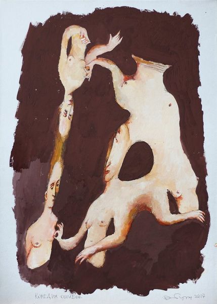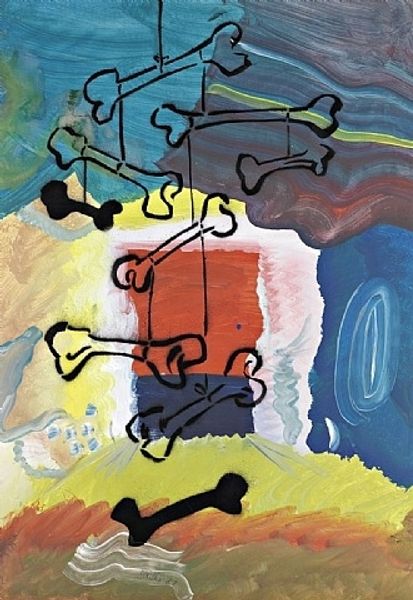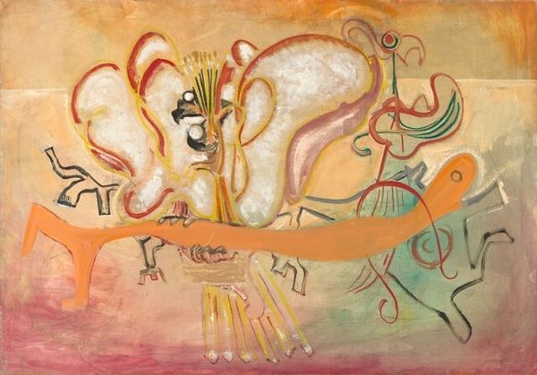 Conroy Maddox painted "Personage en ciel" using surrealist techniques to suggest subconscious realities. The composition is divided into two distinct zones, each housing a biomorphic figure set against a background of contrasting colors. This evokes a sense of dreamlike separation. The upper figure, rendered in softer pastel tones, is fragmented, almost embryonic. Its dismembered body suggests a state of flux and metamorphosis. This contrasts sharply with the lower figure. It is more rigidly structured, with antenna-like appendages and geometric eyes. Maddox plays with the juxtaposition of form and color, creating a visual tension that destabilizes fixed meanings and values. The semiotic interplay invites us to decode these forms and consider how they engage with new ways of thinking about perception and representation. The stark arrangement of forms allows us to consider how Maddox's arrangement creates a dialogue about what constitutes the self.