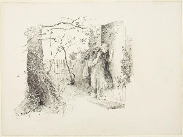Editor: This is Edward Martin Taber’s drawing, "Red Riding Hood Meets the Wolf," housed at the Harvard Art Museums. The delicate linework gives it a storybook feel, yet the wolf is genuinely unsettling. What do you see in terms of the composition? Curator: The stark contrast between the textures delineating Red Riding Hood and the Wolf is striking. Note the smooth, flowing lines forming the girl, juxtaposed against the jagged, almost chaotic strokes defining the wolf. Editor: So the artist uses line to differentiate innocence from danger? Curator: Precisely. The structural opposition underscores the narrative's central conflict. The linear precision, or lack thereof, serves as a visual encoding of their respective natures within the tableau. Editor: That's a great insight. I hadn't considered how the artist's technique reinforces the fairy tale's themes. Curator: Paying attention to this interplay of formal elements adds to our understanding.