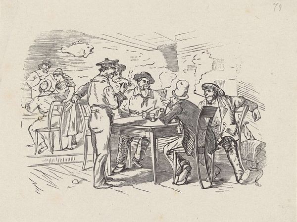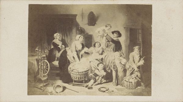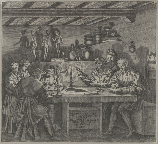 C.A. Lorentzen made this drawing, titled *An Unpacking Scene,* sometime in the late 1700s with pen and wash on paper. It depicts a scene of commerce that seems to be taking place in a merchant's warehouse. The image presents a bustling scene with figures actively involved in examining and appraising goods. It invites us to consider the economic conditions of Denmark at that time. How did trade and commerce shape the cultural life of the period? The artist's decision to depict the figures in such detail, with a focus on their interactions and transactions, underscores the importance of economic activity in everyday life. Further research into Danish trade policies, merchant guilds, and market practices would provide a deeper understanding of the historical context in which this artwork was created. Examining records and account books from this era might shed light on the social relations in the warehouse. What power structures are at play? This would give a richer interpretation of the work.