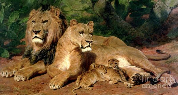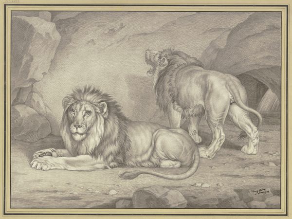 Editor: This is "Lion and Lioness" painted by George Stubbs in 1770 using oil paint. The lioness seems so protective and fierce. What's your take on this dramatic encounter? Curator: This work immediately brings up questions of power dynamics for me. We see the lioness, not the lion, baring her teeth. What do you make of Stubbs choosing to depict the female in such an active, defensive posture? Editor: I suppose it challenges traditional portrayals of male dominance. Were there specific cultural or social factors influencing Stubbs' decision to portray the lioness this way? Curator: Absolutely. Think about the Enlightenment ideals circulating at the time, questioning established hierarchies. Also consider the burgeoning interest in natural history and the "exotic." Stubbs, through his anatomical studies, presents a realism that disrupts romanticized views of nature. How does the landscape contribute to this dynamic? Editor: The dark, almost claustrophobic background makes the scene feel more intense. It almost isolates the pair and puts their raw emotion on full display. Curator: Precisely. And notice how Stubbs uses light and shadow to create a sense of tension. But consider, too, the potential for projecting human anxieties about control, freedom, and even gender roles onto these animals. It is nature but depicted through a very human lens. What have you learned by considering this painting in its historical and cultural context? Editor: I realize how much the context shapes my reading of the work! Thinking about Enlightenment ideas makes the active role of the lioness much more interesting and less like a simple illustration of nature. Curator: Exactly. Art isn't created in a vacuum. Exploring these historical and social threads unveils new dimensions and interpretations, allowing for a richer, more critical engagement with the artwork.
