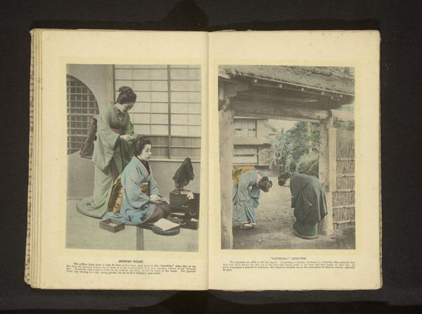 Editor: This is "Vrouw schrijft een brief in een interieur," taken before 1897 by Kusakabe Kimbei. It's a hand-colored collotype photograph currently residing at the Rijksmuseum. There’s a beautiful, almost painterly quality to the scene… but something feels a bit staged to me. What catches your eye in this piece? Curator: The staged feeling, I think, comes from that delicious dance between authenticity and artifice. Look at the objects carefully arranged: the writing box, the scroll… they whisper stories of Japonisme, that European craze for all things Japanese. It makes you wonder about who this woman truly is and what role she's playing. Do you feel a sense of quietude radiating from her posture, from the colours? Editor: Definitely quietude! The soft, muted colors add to that, almost like a watercolor painting. And that scroll is immense, I wonder what it contains? Curator: Right! What emotions is she pouring onto that page? Perhaps anxieties, love confessions? The vagueness invites us to create our own version. Also, notice how Kimbei uses light, it is not as clear or objective like European photographs of the same time! Editor: It does feel softer, like it’s intentionally obscuring detail for a mood. Thinking about her story, and that light… it adds a whole new layer of complexity to my understanding of the photograph. Curator: Yes, it’s in these layers that the art blossoms. That is when this isn't just a photograph. Is becomes poetry written in light and shadows. What story do you take away with you? Editor: I think I'm left wondering about the story behind the performance and if the actual reality can ever align with the version one shares of oneself to the world. Curator: I love it, I am wondering if that will be included on her next letter!