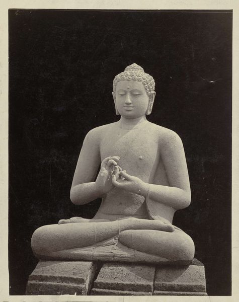 Editor: Here we have Isidore Kinsbergen's photographic print of a Buddha statue, probably taken between 1873 and 1879. It radiates serenity, doesn't it? All that calm in a single, still image. What symbols or ideas do you find most present in this work? Curator: Well, let's consider the "dhyanamudra," the hand gesture. Notice how the hands are resting in the lap, right hand over left, palms upward. It’s a potent symbol of meditation and attaining enlightenment, and we can trace its resonance through centuries of Buddhist art. Doesn't it suggest a closing off from the external world, a turning inward? Editor: Absolutely. The figure's closed eyes and posture definitely emphasize introspection. So, this mudra has held its meaning for how long? Curator: Oh, for millennia! Think of all the hands that have replicated this gesture, physically or artistically, each connecting to the last through shared faith and aspiration. This single, repeated image carries centuries of hope, and transcendence. Consider the broader cultural context here - it's not just a statue but a cultural touchstone. What feelings arise for you looking at it now? Editor: Knowing the history gives me a stronger sense of connection. I am drawn to how such simple hand gestures, repeated and represented through time, can carry so much significance. It speaks volumes about continuity of faith and cultural memory, doesn’t it? Curator: Precisely! This photograph documents a sculpture, of course, but it also participates in this continuity, helping to extend it further. Editor: I hadn't thought of it that way - a document and participant at the same time! It brings another layer to understanding how we engage with images. Thanks!
