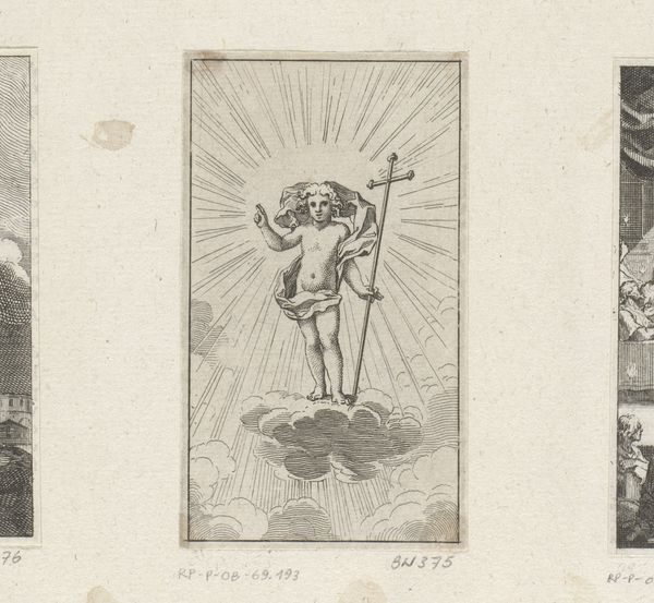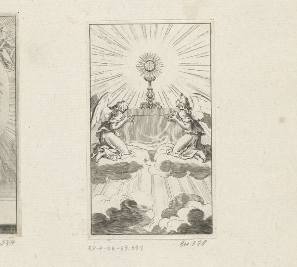 Curator: This image from the Rijksmuseum is titled "Monstrans met God," dating approximately from 1608 to 1688. It's an engraving printed on paper. Editor: My immediate reaction is one of theatrical grandeur; there’s something almost overwhelming about the density of figures and the sheer, intricate detail of the composition. Curator: Indeed. The print makes potent use of verticality; observe how your eye travels from the inscription at the base to the figure of God at the summit. And then note how all is mediated by a light and an elaborately ornate monstrance. It's worth analyzing how the lines define form and suggest volume, especially the clouds with faces. Editor: I am curious about its original socio-religious context. Prints such as this would have served diverse functions from personal devotional aids to elements in larger propagandistic projects that bolster particular theological positions. Do we know much about where this particular print was circulated? Curator: Regrettably, the artist remains anonymous, a not-uncommon occurrence. But we do know, if we consider Baroque religious art from this period, the use of light— the rays emanating from the monstrance— serves as a signifier for divine presence. See how the faces in the clouds look upward in an adoring state. Editor: And consider the inscription! "O Charitas? Caro mea vere est cibus". This use of language underscores a core theological claim and further activates the artwork for viewers familiar with biblical Latin. One might also ask how similar imagery would be understood by both elites and common people. Curator: I agree completely. A study of line, composition, and light rewards the viewer by underscoring meaning. It's all orchestrated beautifully on this rather small surface. Editor: And knowing the broader context—the politics of the time, its religious sensibilities—deepens one’s understanding of this engraving as more than mere decoration. Curator: Precisely, seeing both the inherent structure and its milieu makes the encounter worthwhile. Editor: Agreed, such artwork showcases not just skill but faith reflected through the lens of cultural values.