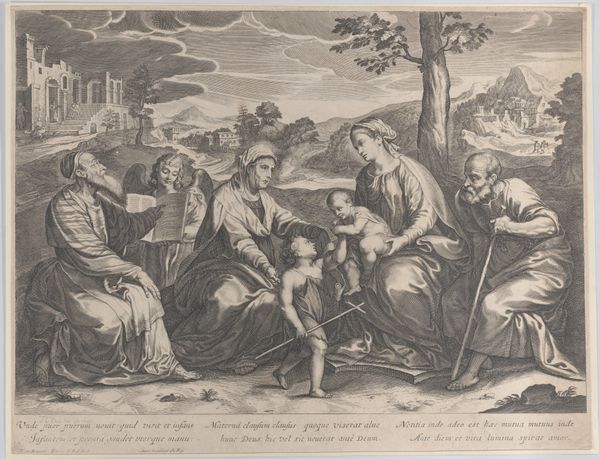 Editor: Peter Thys' "The Mystic Marriage of St. Catherine," painted sometime between 1639 and 1677, depicts a group of figures bathed in a soft, theatrical light. There's something very dreamlike and serene about the scene. What symbols and meanings are embedded within this painting? Curator: Ah, yes! Look at St. Catherine, she's the figure presented to Christ to be married in an ethereal sense of eternal love with Christ, who offers the ring! Notice her palm frond, an attribute denoting martyrdom and triumph. The lamb signifies Christ's sacrificial nature. The image speaks to both earthly beauty and divine union. What emotional or psychological ideas do the figures convey? Editor: Well, the figures seem very composed and calm; there’s a stillness to their expressions. The colour palette almost contributes to that atmosphere; it isn’t high in contrast, yet there are plenty of shades. Curator: Precisely! The expressions convey not just serenity, but also acceptance and devotion, revealing a specific ideal of feminine virtue intertwined with faith. Can you see other images of marriage appearing in works from that time? And what is the value in portraying the saint rather than an important matriarch? Editor: I think I’m getting a clearer picture now. This artwork isn't just a historical record but also a repository of beliefs and shared aspirations through familiar icons and symbols of love! Thank you! Curator: Indeed, a continuous tradition of conveying sacred stories. And a lens through which we might look at marriage itself!