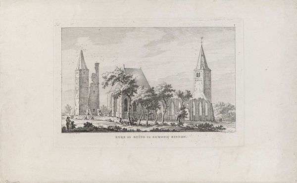 Curator: Here we have an engraving from 1754, "Gezicht op het stadhuis te Franeker" – "View of the Town Hall in Franeker." The artist, unfortunately, is unknown, though he's preserved a striking image of daily life, now held at the Rijksmuseum. Editor: It feels so…still. Not in a peaceful way, but almost frozen. Like a stage set, meticulously crafted but lacking spontaneity. Everything's so symmetrical. Curator: I think that "frozen" feeling speaks to the printmaking process itself and its intended audience. Engravings like this circulated widely, fixing images of civic pride, projecting power and permanence. Note the almost geometrical precision, the ordered composition--reflecting the Enlightenment's focus on reason and control. It almost suggests an idealized civic structure that is aspirational. Editor: Yes, the meticulous detail – the individual bricks, the texture of the trees, those figures milling about. The town hall looms large; but look closer—every character plays its carefully designated role. The boats transporting goods on the canal. Are these figures symbols or signs in this cityscape? What purpose do they have? Curator: They point to Franeker's function as a vibrant hub for trade and exchange in Friesland, reflecting both Dutch Golden Age aesthetics and also the emerging Baroque tastes. The very presence of people—whether fishermen, traders, and those that just reside nearby, tells us how important this governing center would be for this town. There are intersecting systems between power and societal dependency. Editor: You're right, I get this powerful tension here. On the one hand, this stately town hall projecting confidence. But there's a mundane bustle, reminding us of everyday lives that depend upon its power, yet perhaps operate at its margins, or outside the walls and structure we can’t see here in this piece. It would be nice to analyze these concepts. Curator: It reminds us of the function art has had throughout history, creating a reflection of place and time. By better understanding these prints, the more knowledge is afforded about gender, societal norms, political and social identities. Editor: Absolutely. These small frozen snapshots open doors to worlds we can enter. From them, there is much to observe and gain.