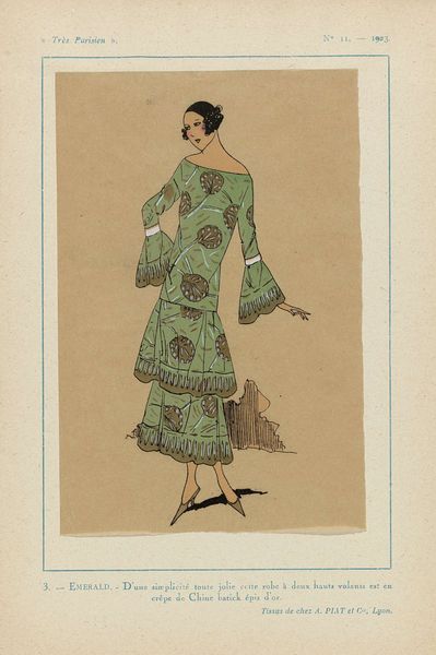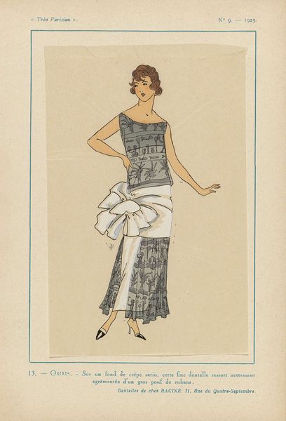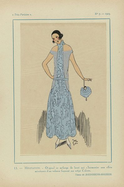 Editor: This delightful piece is "Très Parisien, 1923, No 5: 13.- FRIVOLITÉ. - Élégante et jolie cette robe...", made in 1923. It’s an ink and watercolor drawing. The figure's confident pose, combined with the whimsical details of the dress, creates a surprisingly captivating visual. What strikes you first when looking at this piece? Curator: Formally, my eye is immediately drawn to the interplay between line and shape. The confident strokes defining the figure’s contours are sharply contrasted with the organic, flowing patterns within the dress. Editor: Yes, I noticed how the ribbon’s block color and defined edge breaks that curvilinear pattern. Curator: Precisely! Consider, too, the deliberate placement of the figure within the pictorial space. Note how the framing mimics the very figure, whose composition then reverberates throughout. It’s a study of contained exuberance, is it not? Editor: It does seem self-aware of its artistic confines, yet celebratory, given the name "Frivolité". So you're saying that there is tension between a rather strict structure, on the one hand, and free ornamentation within it? Curator: An astute observation. Indeed, it speaks to a core principle of Art Deco itself, the taming, or at least organizing, of chaos into a visually pleasing order. What do you make of its success, visually? Editor: Well, thinking about how to combine straight lines with an explosion of black shapes, I guess it strikes a great balance and remains very appealing to this day. I see that by focusing on form, one really has much to say about its subject.