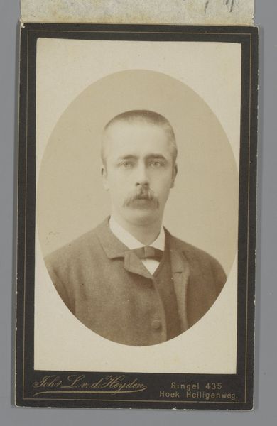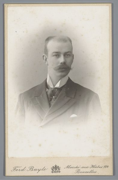 Editor: So this is a portrait from the late 1880s by Wegner & Mottu. It's a photograph of an unknown man. It strikes me as rather formal and reserved. What do you see in this piece that might reveal something about the person or the context of the portrait? Curator: Beyond the sitter’s pose, I’m particularly interested in the conventions of 19th-century portrait photography. Who was being photographed and how? How were these images consumed? Consider this: photography offered a seemingly objective rendering of reality. However, the studio, the photographer, and the sitter's decisions all shaped the image and its cultural meaning. Could it be argued that these types of photographic portrait are the equivalent of today's social media profile pics? Editor: That's a great point. It's a constructed identity, much like social media. Do you think this format reinforced existing social hierarchies or perhaps allowed for a new kind of representation? Curator: It’s a complex situation. Initially, photographic portraits were costly, restricting access to the middle and upper classes. The studio portrait often served as a tool for social mobility, where people could project a specific persona. Later on in the 19th Century, things changed because technical advancement meant greater affordability. Consider what it might have meant to someone to be represented with dignity, particularly during times when negative, stereotypical images circulated widely. Editor: I never considered it from the perspective of identity and power. It's fascinating to think of these images as active participants in the construction of social identity. Curator: Indeed. It is a poignant reminder that art, in any form, is never neutral. Understanding the historical context is key to unpacking the layers of meaning.