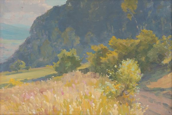 This is an oil painting called Landscape, by Thomas Cole. Immediately, one notices how the composition is dominated by warm, earthy tones of yellow and brown. Cole uses layers of brushstrokes to build up the scene, giving the landscape a textured and dynamic feel. From a formalist perspective, the use of color and light is crucial here. The warm tones create a sense of depth. The structure is divided into three horizontal bands, with the tree line occupying the middle ground to frame the open field. This recalls the ideas of the sublime and the picturesque that were central to the Hudson River School. The painting uses visual elements to evoke emotional and intellectual responses about nature and the human place within it. The absence of defined lines contributes to the romantic and somewhat dreamlike quality, which invites us to contemplate the transition from reality to abstraction. This interplay is a hallmark of Cole’s ability to use landscape not just as scenery but as a means of exploring deeper philosophical questions.