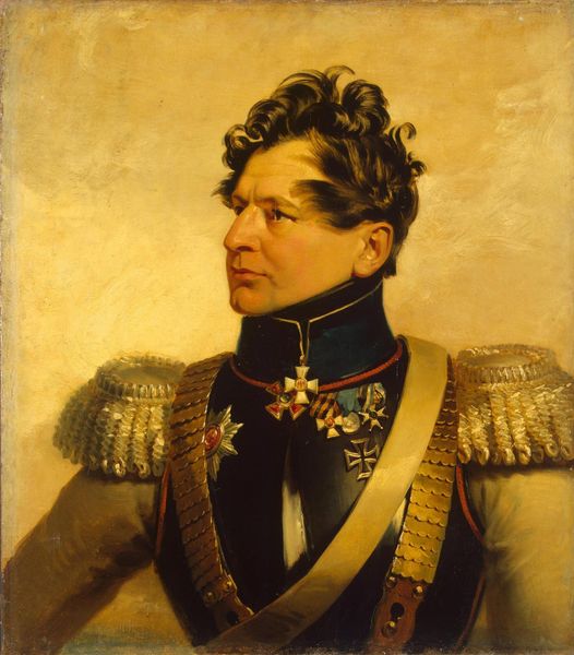 Curator: This is a portrait of Alexander Nikolaevich Ryleev, rendered in oils by George Dawe around 1825. He's depicted with a slightly averted gaze and intense expression. What strikes you initially? Editor: The tension. He seems caught between duty and… something else. A heaviness. It's there in the shadowed side of his face, contrasted with the gilded ornamentation of his uniform. A very weighted Romanticism! Curator: Indeed. Dawe was known for these penetrating character studies, wasn't he? As a history painter, he focused heavily on individuals affected by the socio-political tumult. This work can be interpreted through that lens. Editor: And in Ryleev's case, profoundly so. He was a poet, yes, but much more famously, a key figure in the Decembrist Revolt that challenged Tsarist autocracy just a few months after this was painted. That red of his collar feels almost prophetic. Curator: A fascinating parallel, drawing attention to the radical history within this official depiction. It makes you wonder about Dawe's sympathies and artistic choices, considering he painted a whole gallery of heroes for the Tsar! Editor: Or maybe it speaks to the broader contradictions within Russian society at the time. Reformist ideas percolating within a deeply conservative system. Look at the softness of his hair against the harsh geometry of his jacket – the whole image embodies struggle. Curator: Perhaps that's why Tsar Nicholas I didn’t destroy or hide these portraits, despite many of the subjects being executed for treason. Their sacrifice had meaning within the grand narrative of Imperial Russia, so long as their actions remained symbols of moral failure. The paintings remained public, as lessons in loyalty. Editor: Lessons for some, inspiration for others. Seeing Ryleev now, so soon before his execution, is a stark reminder of the cost of challenging power. He reminds me that visuality shapes both oppression and emancipation. Curator: Ultimately, it underlines the complexities of how artworks navigate power dynamics and act as historical records, often simultaneously promoting and subverting dominant narratives. Editor: Agreed. These paintings always remind us to think critically about who controls not only the present moment, but also the memories we draw on from the past.