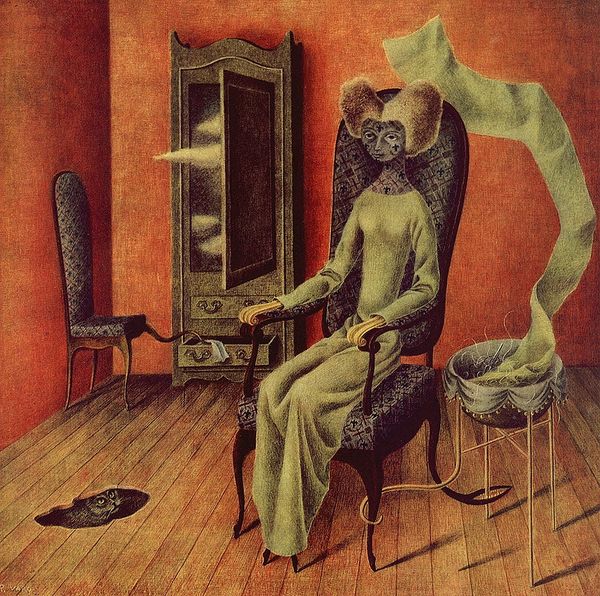 Remedios Varo created the painting "Phenomenon" using oil on masonite, in a style which reflects her engagement with surrealism, science, and mysticism. Varo was a Spanish-Mexican surrealist painter who lived through times of immense social and political upheaval, including the Spanish Civil War and World War II. These events shaped her views on identity, existence, and the search for meaning in a chaotic world. In "Phenomenon", we see a shadowy figure and a deconstructed man in a suit and bowler hat who has been fragmented across a staircase, suggesting a critique of societal norms and masculine identity. Varo's surreal compositions often delve into the subconscious and the exploration of alternative realities. Her works frequently challenge conventional ideas about the self and society. Through the lens of surrealism, Varo explores personal identity and the search for meaning. This invites us to reflect on our own experiences of displacement, transformation, and the quest for belonging.