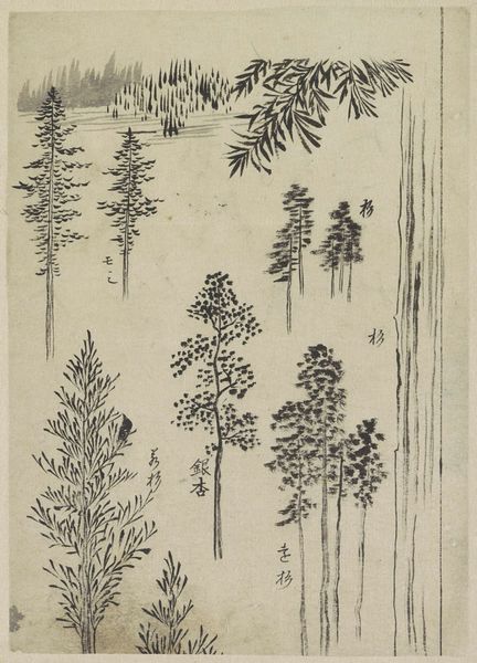 Editor: This print, "Fuji of the Bamboo Grove" by Hokusai, feels like a secret glimpse. I'm struck by how the artist positions us within the bamboo, almost hiding the mountain. What do you make of this framing? Curator: The bamboo grove isn’t just a pretty frame; it's a carefully constructed filter. Consider the historical context: Hokusai was working in a period of increasing urbanization and commercialization. Editor: So, the bamboo is a commentary? Curator: Precisely! It allows Hokusai to use familiar imagery, bamboo forests and Mount Fuji, to engage the changing roles of nature, representation, and national identity in Japanese society. What do you think about that? Editor: It’s like he's inviting the viewer to reconsider their relationship with both nature and national symbols. It makes me want to delve deeper into that history. Curator: And that's the beauty of art, isn't it? It provokes us to question and learn.