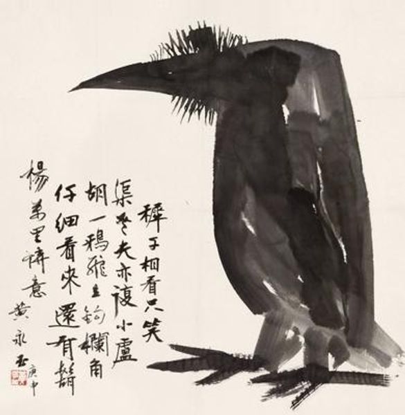 Editor: So, this is "A Bird with a White Neck" by Qi Baishi, painted in 1928 using ink on paper. The stark monochrome palette gives it a really immediate feel. What's your take on this piece? Curator: Let's consider the material conditions of this artwork. The readily available and relatively inexpensive ink and paper speak to a wider accessibility of art production in this period. How does the choice of materials challenge traditional notions of what constitutes ‘high art’? Editor: I see what you mean! So instead of focusing on just the artistic skill, we look at the economic and social factors surrounding its creation? It feels like we're talking about who could afford to make art and how that impacts the final product. Curator: Precisely. Ink painting on paper, while carrying its own established traditions, also presented an alternative to more costly and elaborate forms. Think about the labor involved in preparing the ink, the crafting of the brushes… How do these processes inform your understanding of the artist's work and his relationship to the materials? Editor: It makes me think of the artist as someone really connected to their tools, almost like a craftsperson as well as a fine artist. Does the calligraphy have a role to play too, maybe talking about the price or cost? Curator: The calligraphy adds another layer, intertwining text and image. It directs the artistic production to the literacy levels and cultural context, and how the circulation and value were being generated, or perhaps negotiated at that time. Does that give you another dimension for your response to the piece? Editor: Definitely! Thinking about who made the materials, and how available they were, adds a whole new perspective on appreciating this painting. Curator: Agreed. Examining art through a material lens unveils hidden dialogues about labor, value, and access.