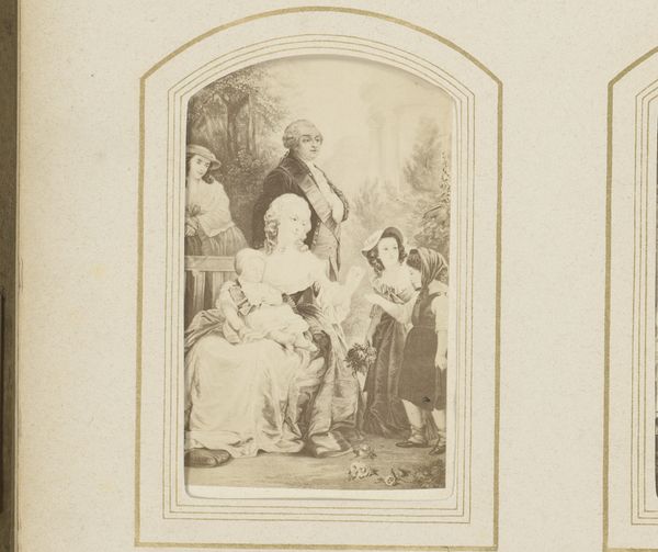 This is an anonymous 19th-century photograph, currently held in the Rijksmuseum, showing an interior scene with two figures, framed by an arch. The monochromatic palette and soft focus contribute to a gentle, nostalgic atmosphere. The composition directs our attention to the contrast in scale and posture between the older man and the child seated on the stool next to him. The formal arrangement here could be interpreted through the lens of semiotics, as the photograph uses recognizable visual codes to communicate ideas about age, innocence, and the transmission of knowledge. The man’s relaxed pose and the child's studious concentration suggests a specific narrative, perhaps a moment of intergenerational exchange. The photograph invites us to reflect on the structures that shape our understanding of family and learning. While the content may seem straightforward, the photograph’s strength lies in how it uses formal elements to subtly play with established meanings.
