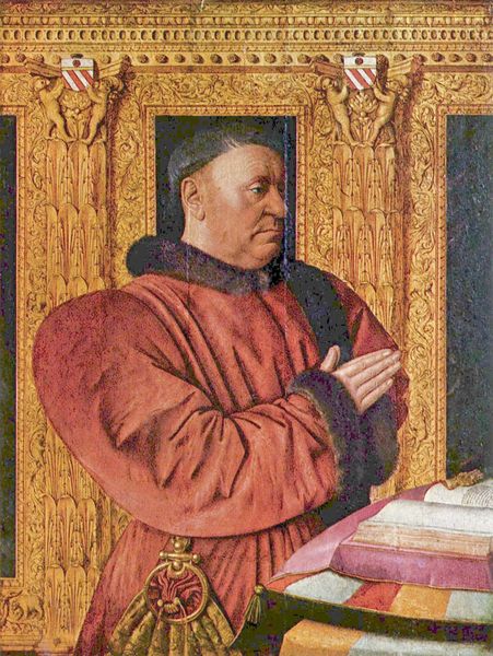 Antoniazzo Romano painted 'Cardinal Philippe de Lévis' using tempera on wood in the late 15th century. The dark background creates a stark contrast with the Cardinal's pale face and hands, drawing our attention to the figure's serene profile. Romano's formalism emphasises clean lines and shapes, giving the painting a geometric quality. This structured composition reflects the intellectual atmosphere of the Italian Renaissance, where clarity and order were highly valued. The cardinal’s garments in vibrant red and white indicate his high status within the church, acting as semiotic markers of power and authority. The meticulous rendering of the hands in prayer adds to the sense of devoutness, reinforcing a cultural narrative of piety. Ultimately, it is this formal arrangement which speaks to the cultural codes of the time and offers a glimpse into the visual language used to convey social and religious standing.