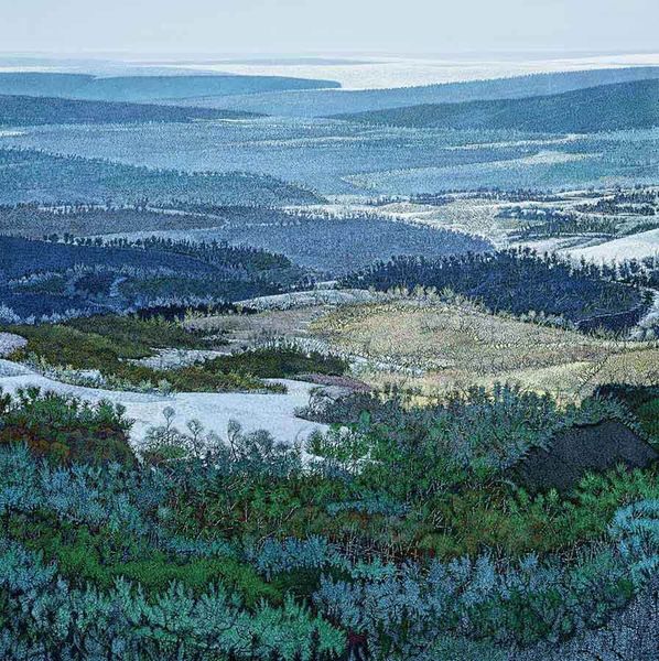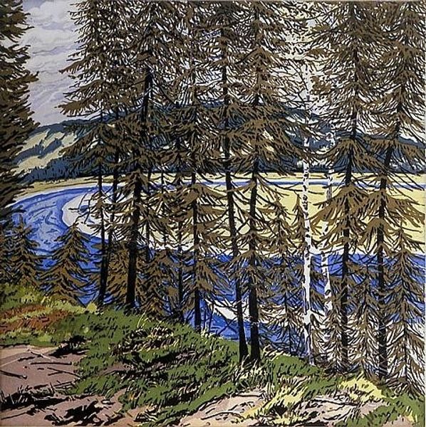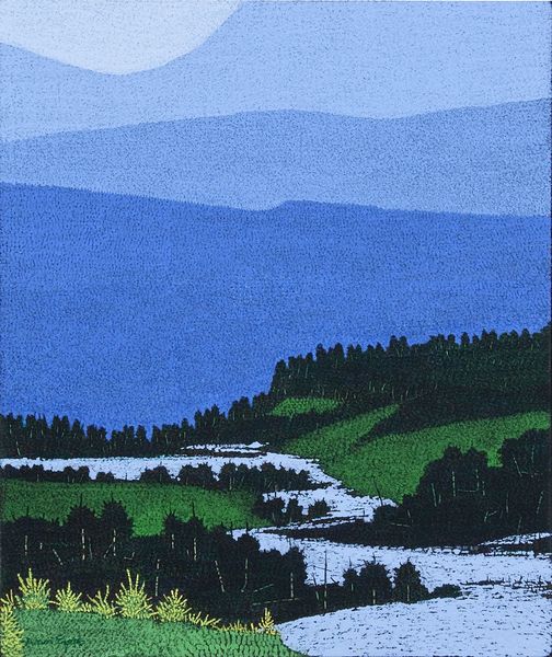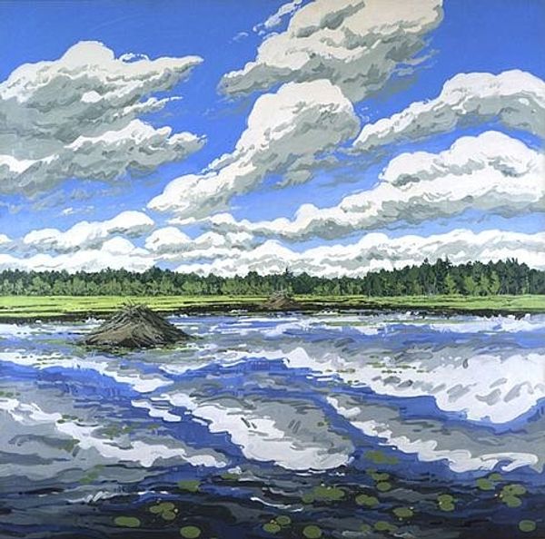 Editor: Neil Welliver’s “Illusory Flowage,” painted in 1996 with acrylic on panel, strikes me as so peaceful, almost meditative. The water's reflections create a really interesting visual push-and-pull. What do you see in this piece? Curator: I see a complex layering of symbolic representation. The reflection itself, is of course a symbol of mirroring and the subconscious. Water has always signified purity, renewal, the flow of time. But look closely at how Welliver renders the trees, solid and stoic and contrasting with ephemeral nature of the reflection. Consider how the uprightness of the trees is undermined. Do you see the visual tension Welliver has created between the grounded, material world and its insubstantial echo? Editor: That’s fascinating! The idea of the trees being stoic, yet visually disrupted, really changes how I see it. Curator: And what do trees usually symbolize? The forest has ancient connections to myths, legends, and the exploration of the human psyche. What do you think the overlapping between the natural world above and mirrored version tells us about what it meant for him to be painting this “en plein air”? Editor: Maybe a desire to understand nature by getting to know it and its own symbolism or reflection of itself. Almost like getting to know another side to himself through nature? Curator: Exactly. The cultural memory ingrained within us connects nature, introspection and the unconscious; Welliver’s “Illusory Flowage” activates this. Editor: I never considered the forest's deeper symbolism. This gives me a totally different perspective on the painting. Curator: Indeed. Hopefully this fresh perspective helps you think of visual material as layered meanings and cross-cultural and individual interpretations. Editor: Absolutely. This has been really insightful; I will look at art and all reflections differently now.