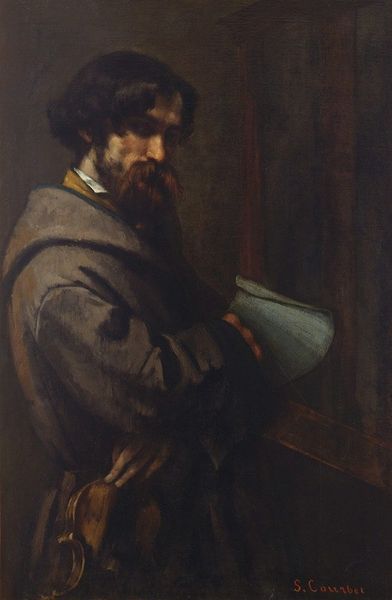 Curator: Here we have Pierre-Auguste Renoir’s 1872 portrait of Claude Monet, rendered in oil paint, capturing a surprisingly intimate moment. Editor: There’s a contemplative air about this portrait. It's all very muted in tone; the figure of Monet blends subtly with the darker background, the wisps of smoke adding to the thoughtful, smoky atmosphere. Curator: Absolutely. Given Renoir and Monet's intertwined histories, this work really allows for a deep dive into the artistic brotherhood that propelled Impressionism. The salons, the rejections, the mutual support. What does this intimate depiction of Monet signal? Editor: It speaks to a rebellion, perhaps. Renoir, known for capturing Parisian life, instead gives us Monet caught in a domestic scene, focusing on intellect rather than fashionable society. There's the pipe, the book... this subverts expectations tied to Impressionism and portraiture itself. Think about the gendered and class-based notions attached to leisure and artistic pursuits at the time. Curator: Right, and Renoir also reframes his peer in a different context. How are artists valued or devalued based on what or who they paint? If Renoir focused solely on landscapes, how would the movement’s acceptance have played out differently? Editor: The relationship between Monet and Renoir, both facing a conservative art world and societal expectations, creates a fascinating discourse around how artists portray each other and navigate these challenges together. This artistic solidarity in the face of societal pressures adds depth. This challenges the romantic idea of the lone genius artist. Curator: It’s interesting to consider the ways social structures impact not just artistic expression, but even the very perception and legacy of art movements. It prompts us to really evaluate art historical narratives that prioritize certain figures or themes over others. Editor: Yes, Renoir’s portrayal captures a moment of personal reflection, but it also triggers reflections about art history and society itself. Curator: Exactly, making us think critically about how the images we consume actively participate in ongoing cultural conversations.
