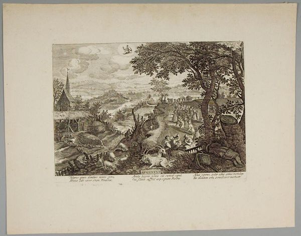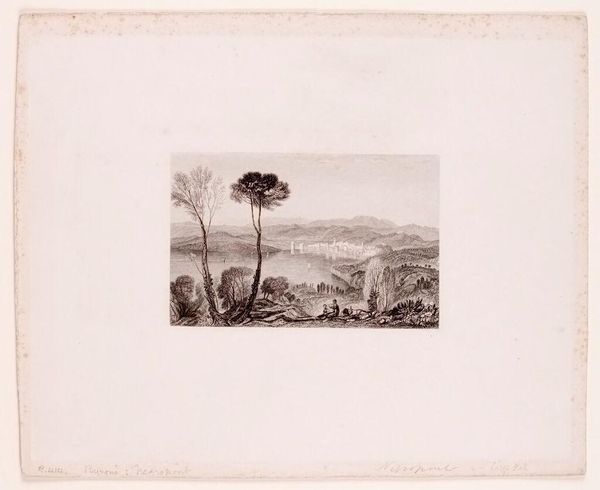 Curator: This is "Landscape" by Thomas Goff Lupton. It offers an image of what I can only describe as sublime and serene vistas. Editor: The monochromatic palette certainly contributes to that sense of serenity, doesn’t it? The soft sepia tones create a unifying visual field. Curator: The landscape is populated with ruins and the echoes of ancient stories. That castle on the left...it reminds me of the persistent narratives of power and decay. Editor: I agree. There's a careful arrangement to the layout of these ruins and other motifs—the positioning of the trees and hills creates a rhythm that really holds the viewer's eye. Curator: The figures are placed to emphasize a sense of scale and solitude. I wonder about their relationship to this ancient place... Editor: And the way light falls, it creates such depth. An excellent study of light and shadow. Curator: An atmosphere so palpable. Editor: Indeed.
