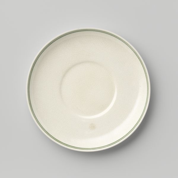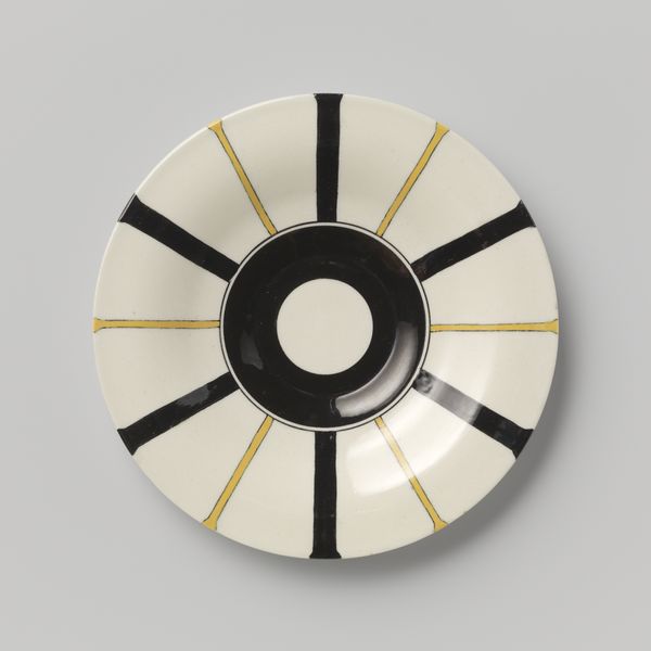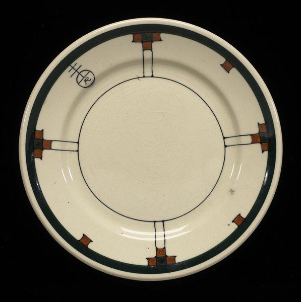 Curator: Immediately, I feel this stark simplicity—almost austere. It’s geometric, yes, but the palette… restrained. It lacks any traditional ornamentation. Editor: We're looking at a "Suprematist plate" by Nikolai Lapschin, likely made between 1909 and 1923. It is a porcelain ceramic piece here at the Minneapolis Institute of Art. Curator: Suprematism taken literally. The symbolism of basic geometric forms elevated… but to what end? Editor: To understand Lapschin's goal, we have to place it in the historical context. Suprematism sought to create a visual language entirely divorced from the natural world, rejecting the decorative excess of earlier eras. It's art reflecting the social and political changes, seeking a universal form accessible and reflecting new political and cultural forms. Curator: Precisely. Look how he uses only a few colors – black, terracotta, and touches of gray – against the white ground. It's a deliberate reduction, pushing beyond mere decoration towards pure sensation and maybe hinting that the world, too, must reduce to be able to see what it truly is. Editor: The shapes are carefully positioned. That large black form on the upper left is echoed and countered by the other one down the plate. The warm terracotta creates some disruption on that rather monochrome pattern, like an unnameable form amongst what seemed very familiar shapes. Curator: Does it truly transcend or just exist in a new kind of cultural vacuum, a porcelain echo chamber? I wonder, was this plate actually used, or was it always intended as an aesthetic statement? Its function – a simple plate – now has social weight added. Editor: A question, indeed! It brings new context and even a quiet subversiveness… a utilitarian object transformed into a vehicle for radical thought. It invites us to reconsider the political charge of a geometric motif, and, of course, wonder about the story the table could have been part of. Curator: Exactly. That's the fascinating tension—between the intended revolution and the almost bourgeois sensibility of a decorative plate, made out of a quite classic medium like porcelain. It forces us to examine the revolution it started within our social narratives and historical assumptions. Editor: So, beyond pure geometry, there’s that layer—a dialogue between object and meaning. I'll remember it that way now.