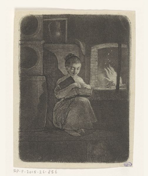 Curator: Let’s turn our attention to "Lezend meisje bij vuur," or "Girl Reading by Firelight," attributed to Jean-Pierre Norblin de la Gourdaine. We believe this drawing was made sometime between 1755 and 1830. Editor: My immediate impression is the overwhelming sense of warmth emanating from such simple materials—pen, charcoal, the intimacy is profound. It’s like a secret whispered in the dark. Curator: That use of chiaroscuro, the dramatic contrast of light and dark, is crucial here. Think about the social conditions around artistic training at this time: how the academies privileged certain techniques of light management. Editor: Absolutely. The light not only illuminates the girl's face and the page of her book, but also highlights the symbol of the flame—traditionally associated with knowledge and enlightenment but here also indicative of domestic warmth, safety, and the quiet pursuit of understanding. Notice how that flame's reflection seems almost like a spectral hand in the window. Curator: The ambiguity of that “hand” intrigues me. During this period, increased literacy rates reshaped social life; books became increasingly accessible to a wider public. I wonder if the artist is subtly hinting at the allure of narratives – even ghost stories – found within the pages of the book. What fantasies does she encounter within its pages? Editor: Perhaps. Or perhaps it symbolizes the guiding hand of knowledge. The iconography around hands themselves shifted drastically through the Enlightenment, they serve as both signifier of craft as well as connection. To read required both vision and a learned craft, didn’t it? Curator: A useful point. These nuances tell us a great deal about 18th century values regarding domesticity, literacy, and artistic practice. These spaces of learning and development, for young women especially, are important considerations in how we historicize this era. Editor: And ultimately, this captivating drawing remains relevant because it manages to convey not only a cultural moment, but a deeply personal connection with reading. It beckons each of us to remember our own cherished moments of solitary exploration.