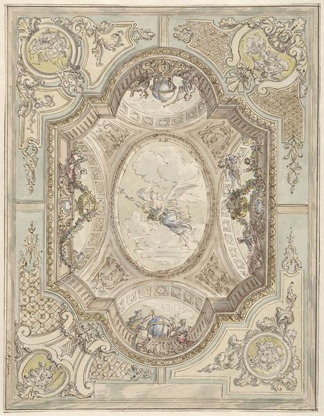 Curator: This watercolor, "Design for a Ceiling" by Daniel Marot the Elder, made between 1707 and 1717, presents an ornate, baroque vision. Editor: My first thought is—dizzying! In a good way. The swirling figures, soft palette, and the perspective play tricks on your eyes. You can almost feel yourself tilting back to take it all in. Curator: Right, and consider the production of these grand interiors. Marot wasn't just an artist, but also a designer and engraver. This ceiling design, realized in watercolor, would eventually inform the labor of many artisans: plasterers, painters, sculptors, all contributing to a unified, if hierarchical, decorative scheme. Editor: Absolutely. And those hierarchies are so embedded here. Who gets to *look* up at this ceiling, right? The artwork speaks volumes about power structures, class, and the construction of identity within privileged spaces. The visual language of baroque art served to reinforce and naturalize such social orders. Curator: Precisely. Think of the material investment: costly pigments, the highly skilled labor to execute it. This was all financed by a specific segment of society to communicate prestige. Beyond the allegory, the very existence of this piece testifies to particular relations of production. Editor: It makes you wonder about the individuals, perhaps even women, who worked on these immense projects—the anonymous craftspeople behind the gilded frames, the intricate plasterwork. How their stories intersect, or don't, with this grand, sweeping vision is compelling. Curator: And understanding those conditions really reframes the way we appreciate the artistry itself. The sublime, yes, but also the material realities underpinning its creation and its function in its time. Editor: Seeing this drawing today encourages a layered understanding of not only baroque artistry, but also its enduring echoes within social history. Curator: I agree completely. Considering this work, through material means helps clarify the relationship between artistic production and society. Editor: By seeing this through the context of art history we can deepen our knowledge of intersectionality.