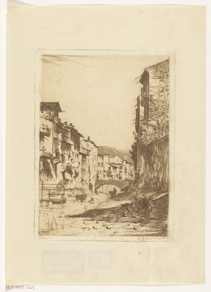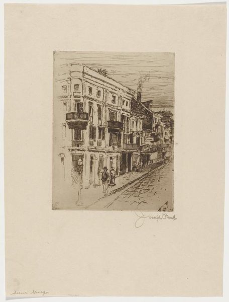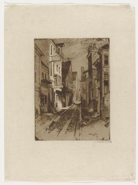 Curator: Joseph Pennell created "Plow Inn Yard" in 1881. It's currently held here at the Minneapolis Institute of Art and is an etching, giving it that distinct linear quality. Editor: It's got this faded, wistful quality. Makes me think of old photographs and half-remembered stories. Like looking into someone's dream of a forgotten town. Curator: The scene depicts an alleyway, typical of the period, probably somewhere in the eastern United States. It's fascinating to see how such mundane, everyday scenes became the subject of art. This choice reflects the broader trend to find artistic merit in the common experience. Editor: True, and the everyday feel of the scene is quite striking. Note the folks riding away under that archway...it's not a grandiose or noble depiction; it’s life just happening, you know? Just rendered beautifully in tones of light and shadow, I really dig the composition here and find it very immersive. Curator: And I would argue that immersion depends greatly on our social positioning, past, present and the context in which this drawing will become available to the masses. For instance, considering the role of etchings and prints in democratizing art ownership during the late 19th century gives "Plow Inn Yard" even more appeal. Editor: Absolutely, it reminds me that even history has layers. You dig beneath the surface and suddenly an etching like this becomes not just an image, but a portal. This picture has that capacity to stir the imagination and remind us how art shapes, and is shaped by the world. Curator: Precisely. So next time you are at a pub and people engage in conversation and fun, I encourage you to close your eyes for a moment to observe everything around and then allow it to resonate and flourish freely. This is why "Plow Inn Yard" invites that sensation, in an image that continues to move through time to touch the very soul.