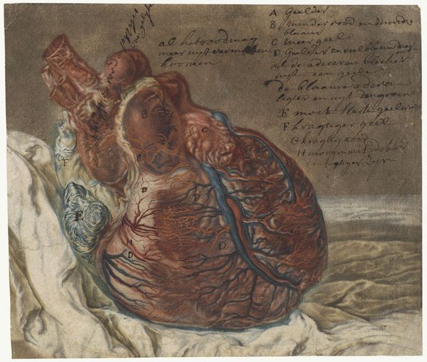 Editor: This drawing, "Anatomische studie van een menselijk hart," created between 1700 and 1750 by Jan l' Admiral, strikes me as incredibly detailed, almost disturbingly so. What do you see in this piece, beyond the obvious anatomical study? Curator: The unsettling realism you observe points to a fascinating tension in the history of art and science. This work exemplifies the 18th-century's burgeoning interest in empirical observation and its display within the public sphere. It reflects not just scientific inquiry, but also the institutional frameworks that were developing to disseminate knowledge. How do you think this image would have functioned within that social context? Editor: I suppose it would've served both an educational purpose for medical students and perhaps as a spectacle, contributing to a sense of awe and, maybe, control over the human body. Were these types of images common at the time? Curator: Anatomical illustrations were indeed gaining traction, reflecting a shift in attitudes toward the body from religiously sacred to scientifically accessible. The question is how such accessibility shaped public understanding and perception of health, mortality, and even personhood. Editor: So, it wasn't just about documenting anatomy but also about shaping perceptions. That’s much broader than I initially considered. I guess even the artistic style used could subtly shape how viewers understand it. Curator: Exactly. Think about the way the artist has presented the heart—placed delicately on cloth. It isn't simply an organ, it is theatrically presented for consumption, so to speak. Now, considering all that, does your reading of the work change at all? Editor: It definitely does. Now I am reflecting on the theater of medical science! This has changed how I see such images and the public consumption of anatomical imagery in that era. Thanks!