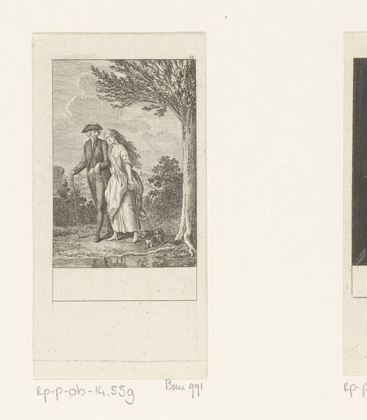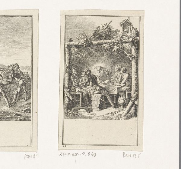 Curator: The Rijksmuseum holds this 1778 engraving and etching, titled "Ruiter geeft een arme jongen geld," which translates to "Rider giving money to a poor boy". It's the work of Daniel Nikolaus Chodowiecki. Editor: My eye is immediately drawn to the sharp contrasts achieved through the dense lines of the engraving. The texture is incredibly intricate, giving a tangible weight to everything within the image. Curator: Chodowiecki was quite interested in exploring the theatricality of everyday life during the Enlightenment. Note how he positions the rider elevated on horseback in contrast to the seated figures on the ground, thereby illustrating societal stratification and a very pronounced visual of class. Editor: Yes, the horse acts as a vertical barrier as well as emphasizing the riders' control of the visual space; and you can't overlook how skillfully Chodowiecki renders the anatomy of that horse, using a relatively limited set of graphic elements. The delicate shading models its form so expressively! Curator: The choice of printmaking also allowed for a wide distribution, which enabled Enlightenment ideals concerning compassion and social justice to reach a broader audience. Chodowiecki really understood the potential of reproducible media as an instrument for societal reform. Editor: Notice how the figures are arranged in a way that subtly guides the eye – from the rider down to the boy receiving the coin, and then out towards the family looking hopefully on. The engraving itself constructs the dynamics it represents, shaping and directing our perspective through form alone. Curator: The artist provides us with more than just an interaction; he showcases the moment through a particular political lens and a subtle critique of 18th-century social inequalities. Editor: The economy of lines creates an astonishing wealth of visual data. There's a real refinement in the details of clothing, gestures, the very way light seems to filter through the scene. I notice the entire scene is also contained within a simple border frame, adding a touch of formality. Curator: Overall, this work is a study in contrasts – materially, socially, and ideologically. It showcases the complexity of visual narratives in shaping our understanding of compassion and inequity. Editor: A fine example of how formal artistry elevates a narrative moment into a reflective experience.