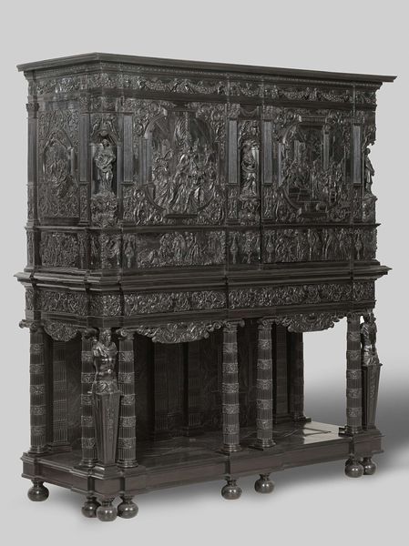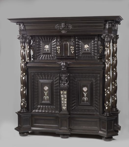 This Kast or Zeeuws cupboard, of carved oak, stands as a testament to the intricate craftsmanship of its anonymous maker. It offers a fascinating glimpse into the domestic lives of 17th-century Zeeland, a maritime province of the Netherlands. These monumental cupboards were status symbols, reflecting the wealth generated from the Dutch Golden Age's mercantile activities. The geometric panels and robust carvings are distinctly Dutch, yet the cupboard's imposing presence also speaks to a broader European aesthetic. Note the faces carved into the columns. These figures evoke a sense of ancestral presence, aligning the family within a continuum of history and social standing. While this cupboard embodies the success of a specific class, we might also ask, whose labor produced this opulence? How did the complex network of trade and colonization factor into its creation? The Kast reminds us that even the most functional objects carry a multitude of stories. They reflect not just individual taste, but the larger currents of power, identity, and historical change.