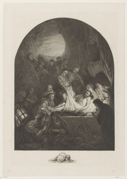 Curator: It seems that what we have in front of us is “Ouders treffen hun slapende dochter aan in een vissershut”, from 1771, made with ink and charcoal, on paper. The artist is Jean Baptist Leprince and it resides in the Rijksmuseum. There’s a compelling narrative element to this work, but the figures appear somewhat ghostly. What strikes you most about it? Editor: I'm drawn to the contrast in textures—the rough-hewn nature of the shack versus the soft depiction of the sleeping figure and her linens. What does the material reality of this piece—ink and charcoal on paper—tell us about the social context of its creation? Curator: The choice of drawing, as opposed to a painting, speaks volumes about accessibility and function. Ink and charcoal are relatively inexpensive, and paper allowed for reproducibility. Think about who would have been consuming such images in 1771. Was it for elite collectors or a broader public? And what narrative needs was Leprince responding to? Editor: Perhaps the story itself was meant to be circulated widely. It is very interesting that those are not the "noble" materials generally seen, I wonder if those were available to all social classes. Do the fishing hut setting, the sleeping girl and her concerned parents…do these figures represent archetypes for the intended audience? Curator: The setting places the narrative in a world of labor and resource extraction – the fishery. Look closely. What can you infer from the still-life elements in the bottom left: The basket and its contents? And consider how the scene is staged as a ‘discovery,’ suggesting themes of vulnerability and perhaps even morality, being circulated for a rising merchant class with a growing sense of domesticity and concerns about family. The very act of Leprince creating multiple versions, allowed these bourgeois moral concepts to filter down and to spread, as they were consumed. What do you think? Editor: That’s insightful. I see how the relatively cheapness of this production parallels with the rise of a new social order interested in different stories. Looking at it now I also agree that is meant for the family unit of that time. It puts things in context that otherwise, would have seemed random or disconnected. Curator: Exactly! Examining the materials and their accessibility allows us to unravel not just the story *within* the artwork, but also the story *of* the artwork, its place in the economic and social fabric of its time.