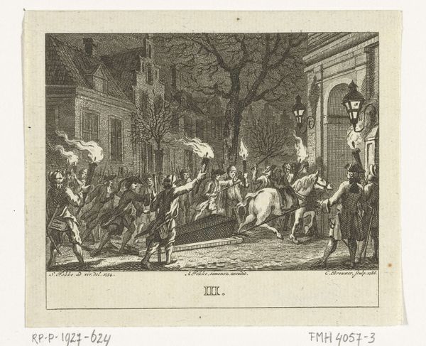Editor: So, this is "Divertissiment de la foire d'Amsterdam" by Jacobus Houbraken. It looks like a chaotic street scene, everyone scrambling with flags and…are those toy muskets? What’s your take? Curator: My take? It's a beautiful little explosion of the absurd! It's like Houbraken captured a fleeting moment of carnival madness, don't you think? Almost theatrical, the way the figures spill out of the building, onto the street. Editor: Theatrical… like a staged fight? Curator: Exactly! It’s a fever dream of childhood play and adult satire, blurred into one frenetic etching. It makes me wonder, were these 'diversions' actually this… intense? Editor: I never would have guessed it was satire. I’ll look at fairs differently now!