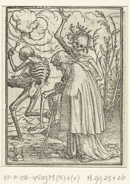 Curator: This woodcut, "The Young Child," is by Hans Holbein the Younger, who died in 1543. The work is housed here at Harvard Art Museums. What catches your eye? Editor: The stark contrast between the playful child and the looming figure of Death is immediately unsettling. It's a memento mori, isn't it? Curator: Exactly. The hourglass, the cooking mother, all symbols of time passing, life fleeting. Holbein reminds us that death is always present, even in innocence. Editor: Death's scythe feels more like a plaything in the child's grasp. An almost casual acceptance? Curator: Perhaps. Or maybe the child, in their innocence, doesn't yet understand the weight of that symbol. It's a dark image with strange pockets of light. Editor: It’s fascinating how such a small image can hold so much fear and contemplation. Curator: Holbein's economy of line amplifies that emotional impact, I feel. A stark reminder of our mortality. Editor: It certainly leaves you pondering life’s delicate balance.